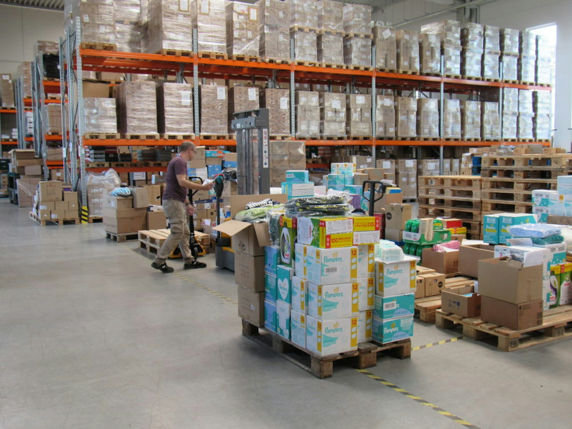 Große und kleine Chargen unterschiedlichster Waren im Wert von zwei Millionen Euro lagern in der Halle. Palettenweise Windeln aus Überproduktion, in kleinen Stückzahlen Markenrucksäcke mit dem Design des Vorjahres, Dutzende Verkaufsdisplays mit Pflegeprodukten von einer Palette, deren Plastikhülle einen Riss hatte – solche Sachen werden gerade verteilt.
