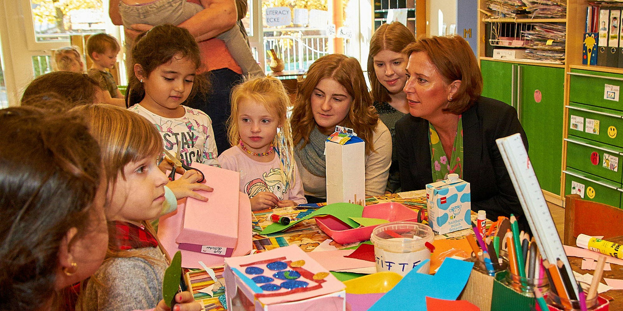 Petra Lebens von der Gesamtschule bastelt mit Kita-Kindern.