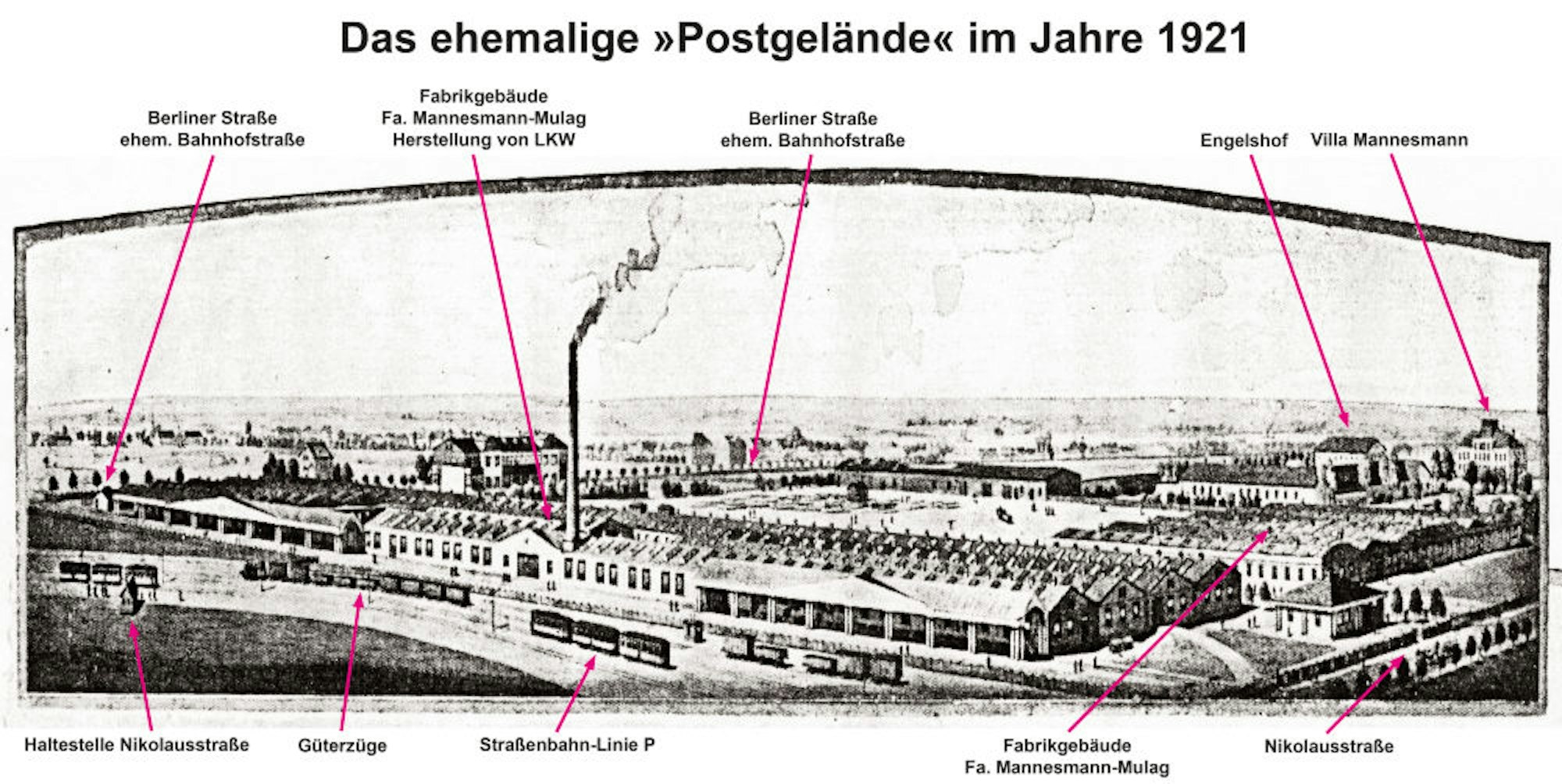 Der zweite Schornstein, um den es in der Fragestellung ging, lag auf dem ehemaligen Postgelände zwischen Nikolausstraße und Berliner Straße, wo inzwischen ein attraktives Wohngebiet entstanden ist. „Er stand direkt an der Straßenbahnlinie P, heute Linie 7“, hat Pfennig erfahren. Der Schornstein gehörte zu den Fabrikhallen der Firma Mannesmann Mulag, die während des Ersten Weltkrieges dort Lastwagen herstellten. Die Hallen wurden in den 30er Jahren anderweitig genutzt. Der Schornstein, der die Hallen überragte, wurde erst in den 1960er Jahren gesprengt, „und zwar später als der Schornstein der Ziegelei“, wurde den Archivmit-arbeitern der Bürgervereinigung berichtet.