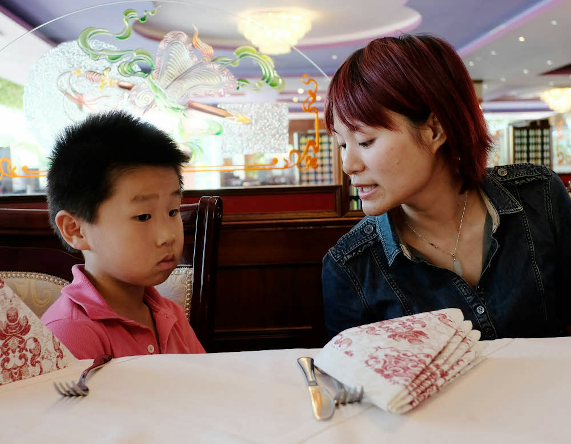 Restaurant-Chefin Qun Chen mit ihrem Sohn Eric, der gerade aus der Schule gekommen ist.
