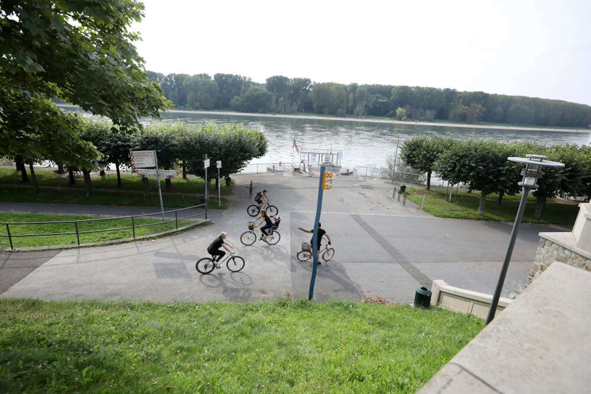 Beliebte Strecke auch von Radlerinnen und Radlern ist der Weg am Rheinufer (l.). Unter den Kopflinden sitzend genießen Anwohner die Aussicht auf den Fluss (r.).
