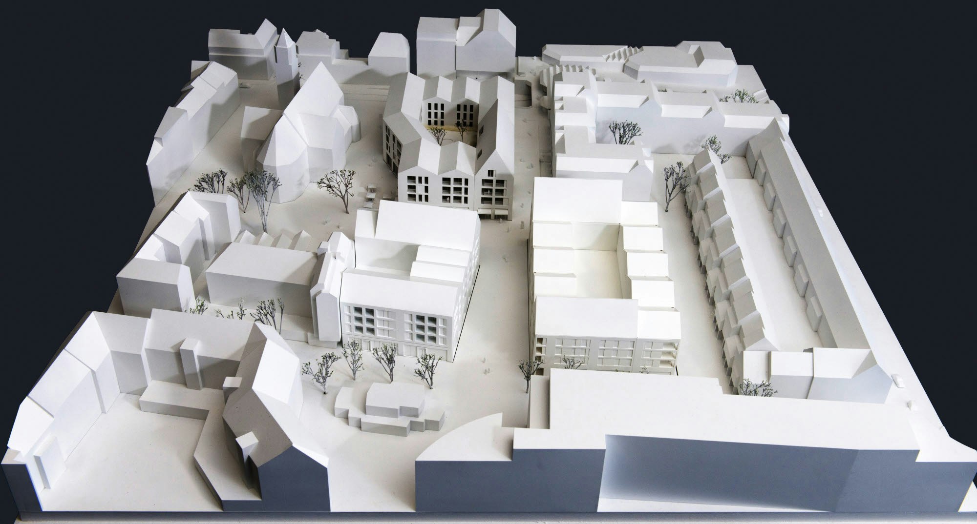 Das Modell zeigt die freigestellte Kirche, Haus 1 zur Hauptstraße hin sowie die Häuser 2 im Norden und 3 im Süden.