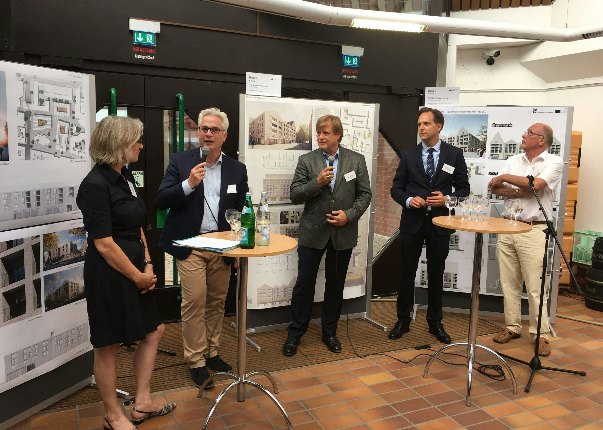 Die Architekten brachten den Gästen der Vernissage die Eigenarten ihrer Planungen nahe. Konstantin Jaspert (JSWD, Haus 1) sprach von einer Innenstadt, in die man die Porzer einlade, statt über den Abwärtstrend für den Einzelhandel aufgrund des wachsenden Online-Marktes zu lamentieren. Der schon gesetzte Entwurf für Haus 1 orientiere sich am „Gasse-Platz-Konzept“, setze auf Kleinteiligkeit statt Großstrukturen. Lebendig würden die Ziegel-Fassaden durch subtile Unterschiede bei der Verfugung.