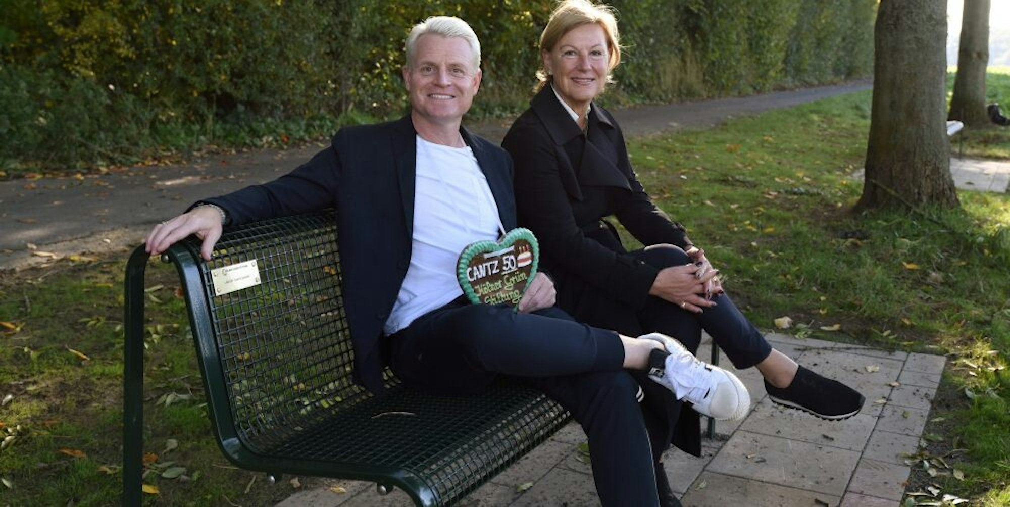 Guido Cantz mit Beatrice Bülter von der Grün-Stiftung auf einer „seiner“ Bänke.