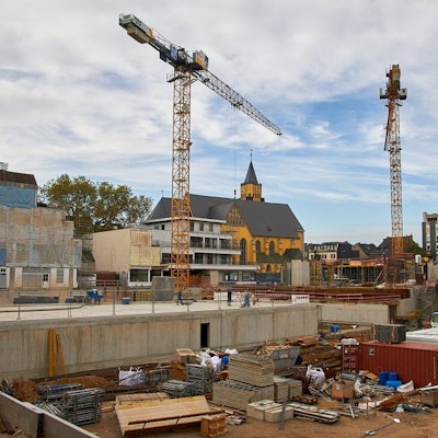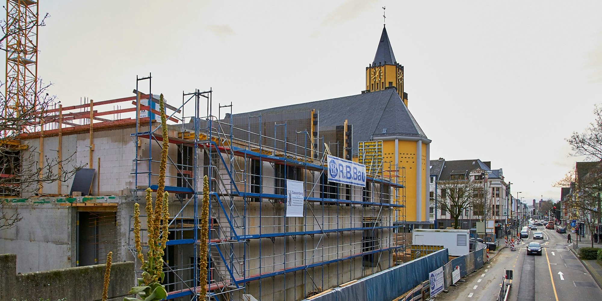 Die neue Porzer Mitte wächst. Das erste der drei neuen Häuser wird derzeit gebaut.