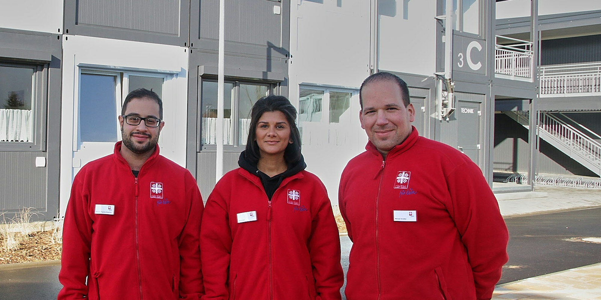 Die Sozialarbeiter Behnam Bijdely Shamloo (v.l.), Sima Kadi und Michael Schäfer kümmern sich um die Bewohner in der neuen Unterkunft.