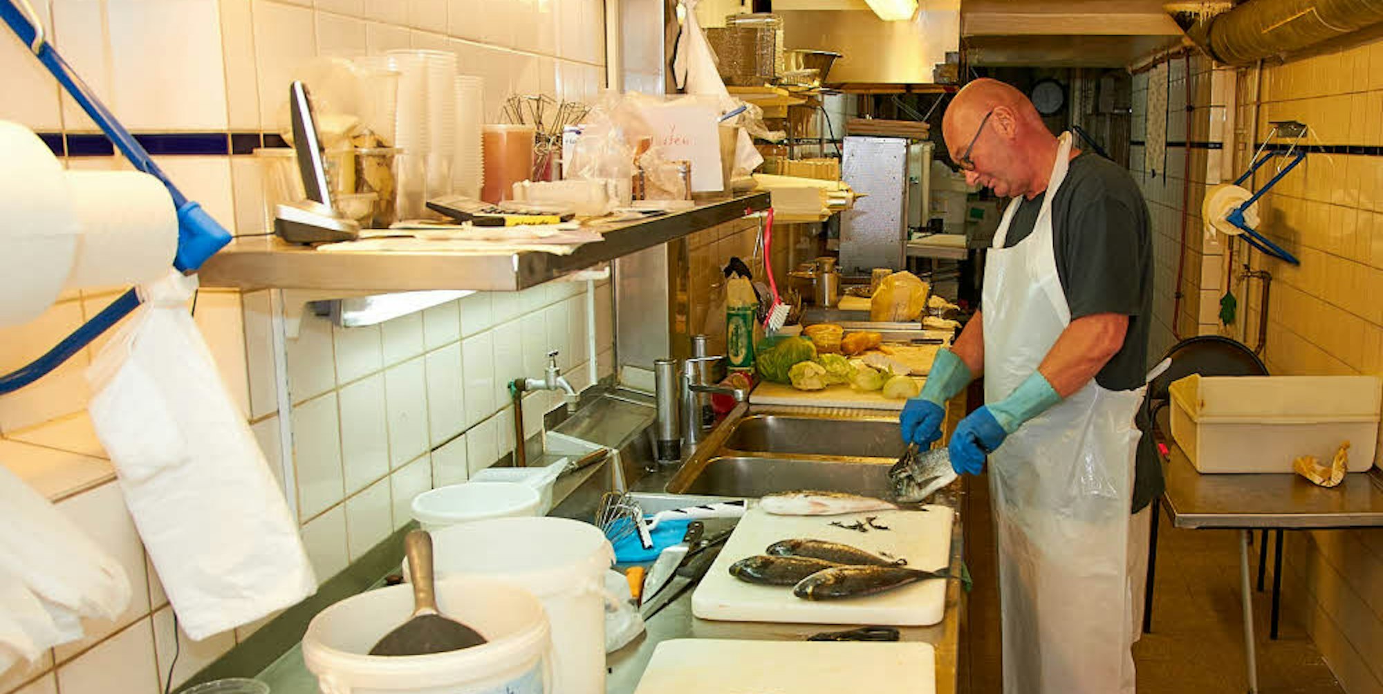 Das Ladenlokal liegt zwischen zwei Häusern und ist nur zwei Meter breit, es ähnelt einem langgezogenen Flur. Hinter der Verkaufstheke, in der der frische Fisch auf Eis präsentiert wurde, gibt es nicht viel mehr als ein Waschbecken, eine Fritteuse und ein Kühlhaus. „Anfangs haben wir die Ware direkt aus dem Hänger verkauft, den hatten wir zum Kühlhaus umgebaut“, schildert Buchholz.