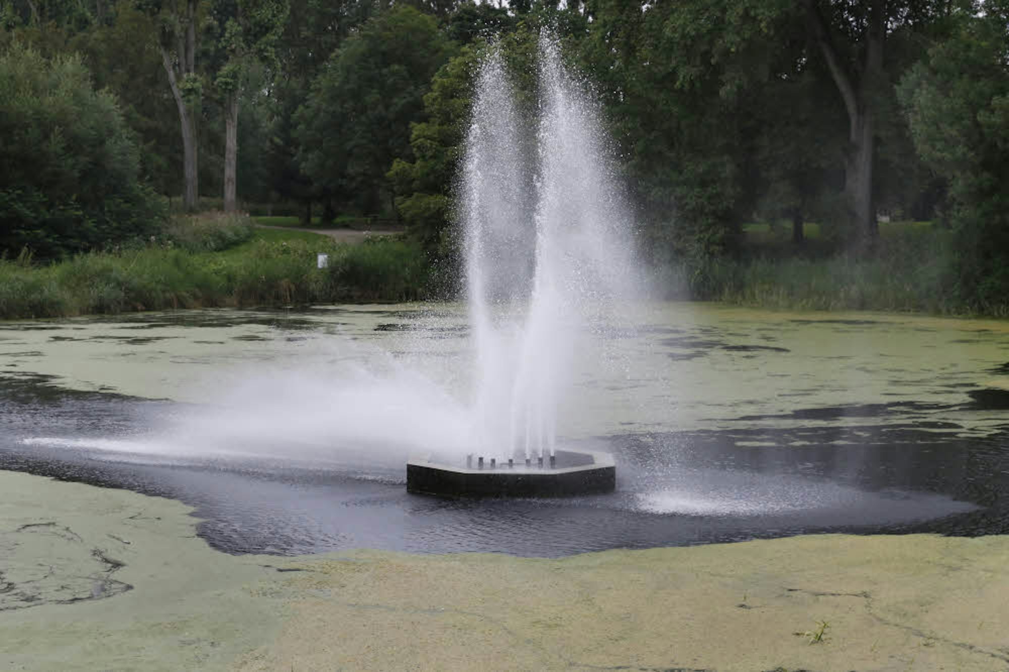 Nach dem Grün-Rechen von der Wasseroberfläche soll ein Taucher den Ansaugkorb der Fontäne auf Algenbewuchs untersuchen, wo sonst ein weißglitzernder Wasserstrahl gen Himmel jagt, spritzt jetzt das Wasser so müde und planlos, als hätte jemand einen defekten Duschkopf in den See gelegt. Sprudelt das Wasser erst wieder richtig, wird das Gewässer auch besser mit Sauerstoff versorgt.