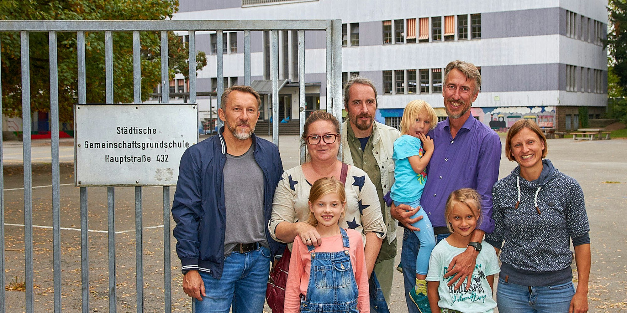 Die Schule muss an der Hauptstraße bleiben, fordern die Elternvertreter Norbert Laslo (l.), Andrea Ring (2.v.l.), Skadi und Achim Kautz (r.); unterstützt werden sie von Klaus Schäfer (M.), Geschäftsführer vom Bündnis Porz-Mitte.