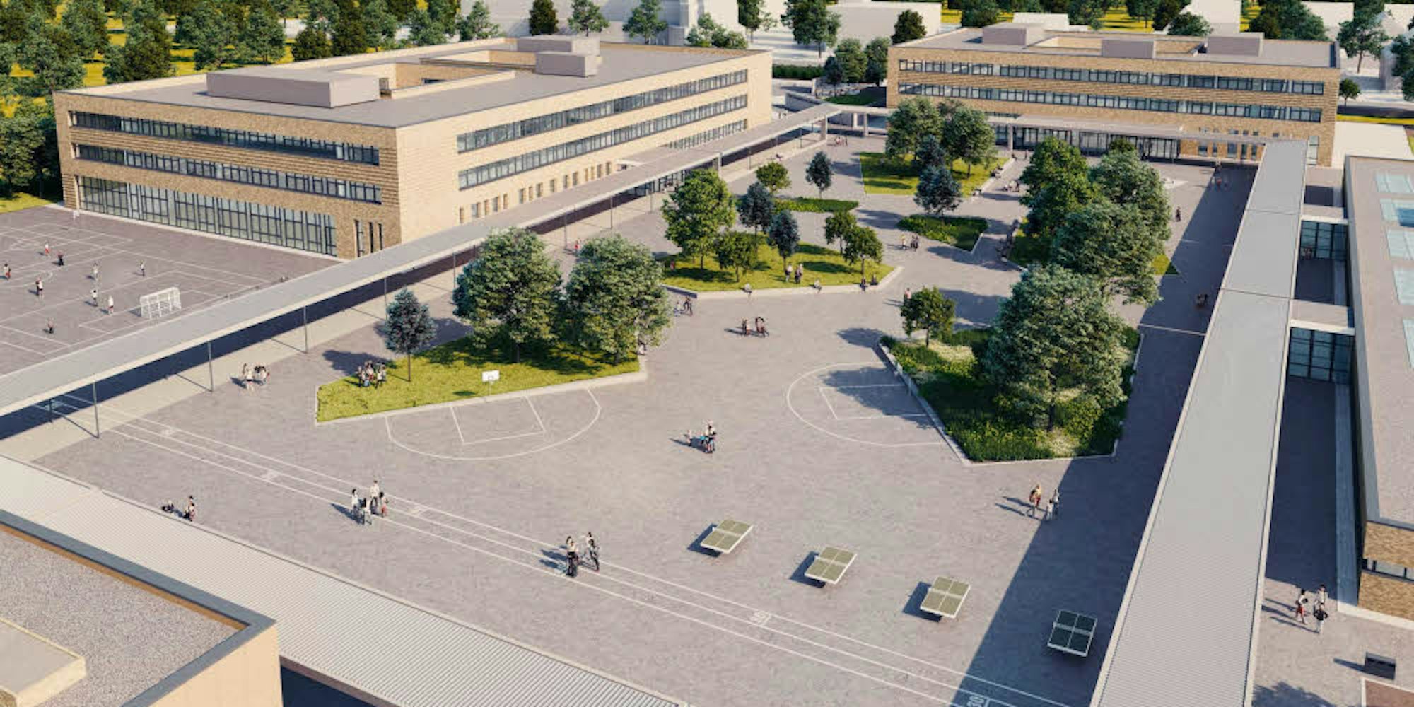 Wie bei einem Campus gruppieren sich die Gebäude des großen Gymnasiums in Weiden um den Schulhof.