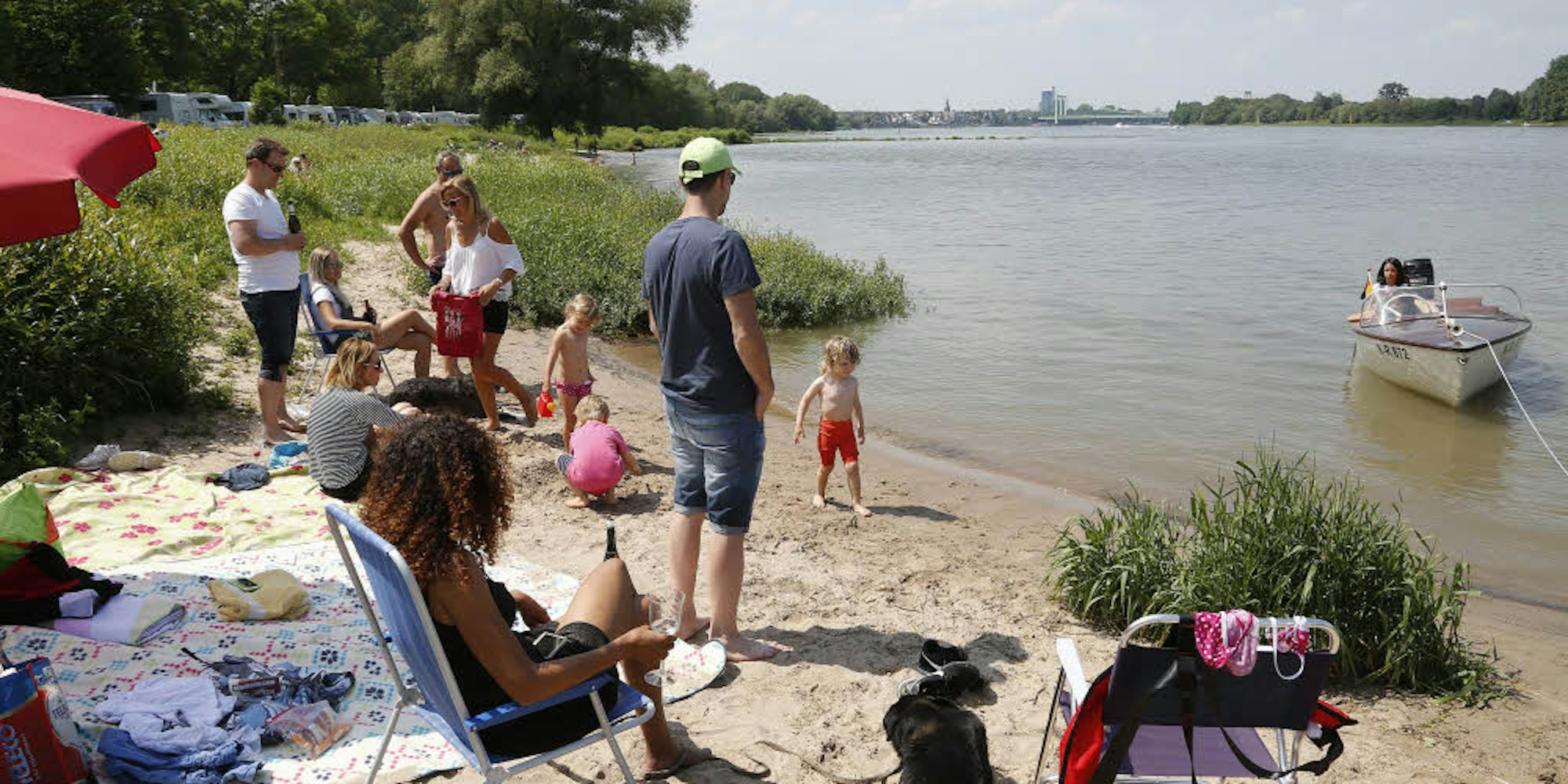 Nur ein paar Schritte sind es für die Camper von ihren Wohnwagen bis zum Rhein-Strand.