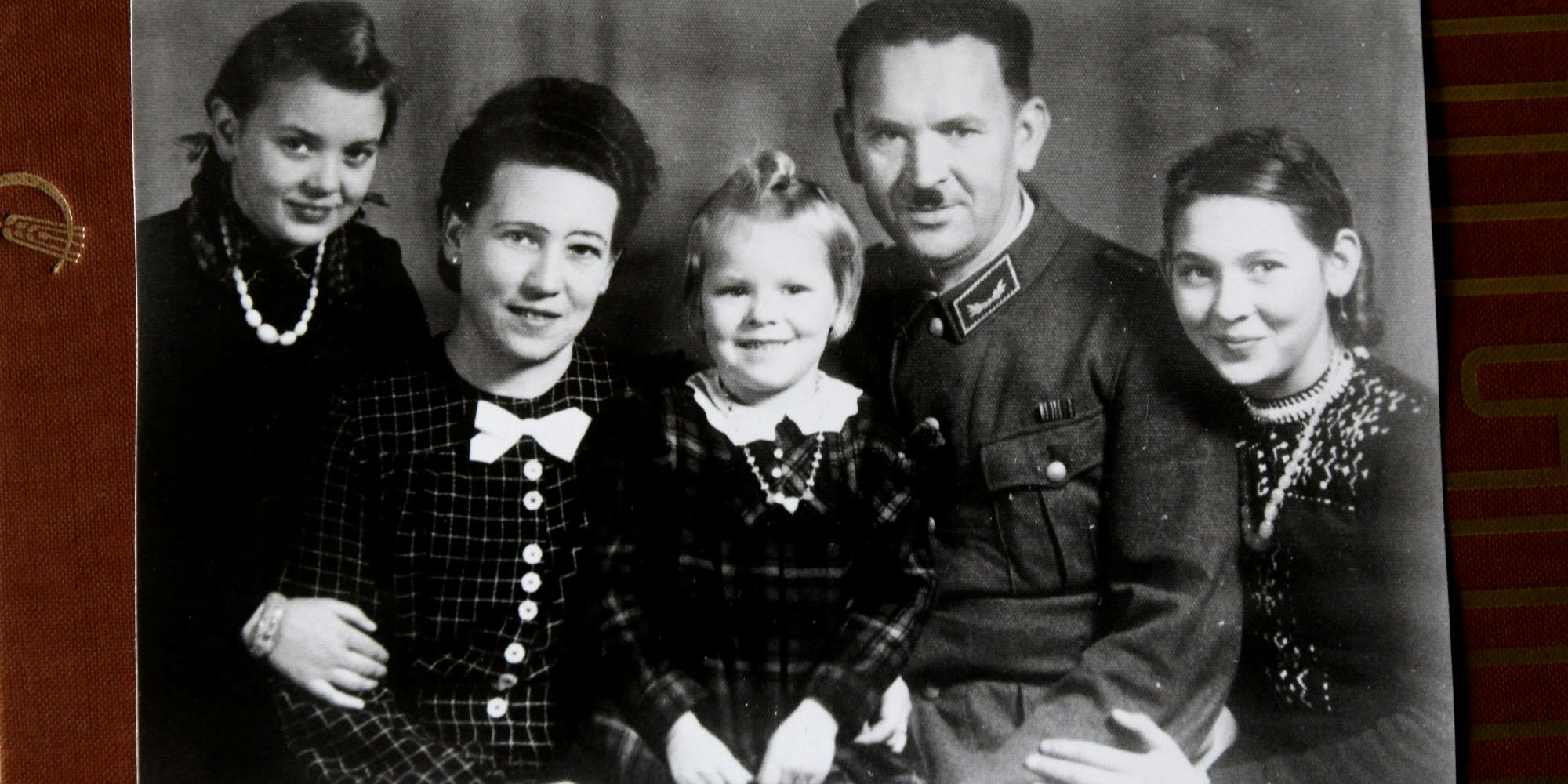 Helga Hoffmann (Mitte) mit , Mutter, Vater und ihren Schwestern während des Kriegs 1944