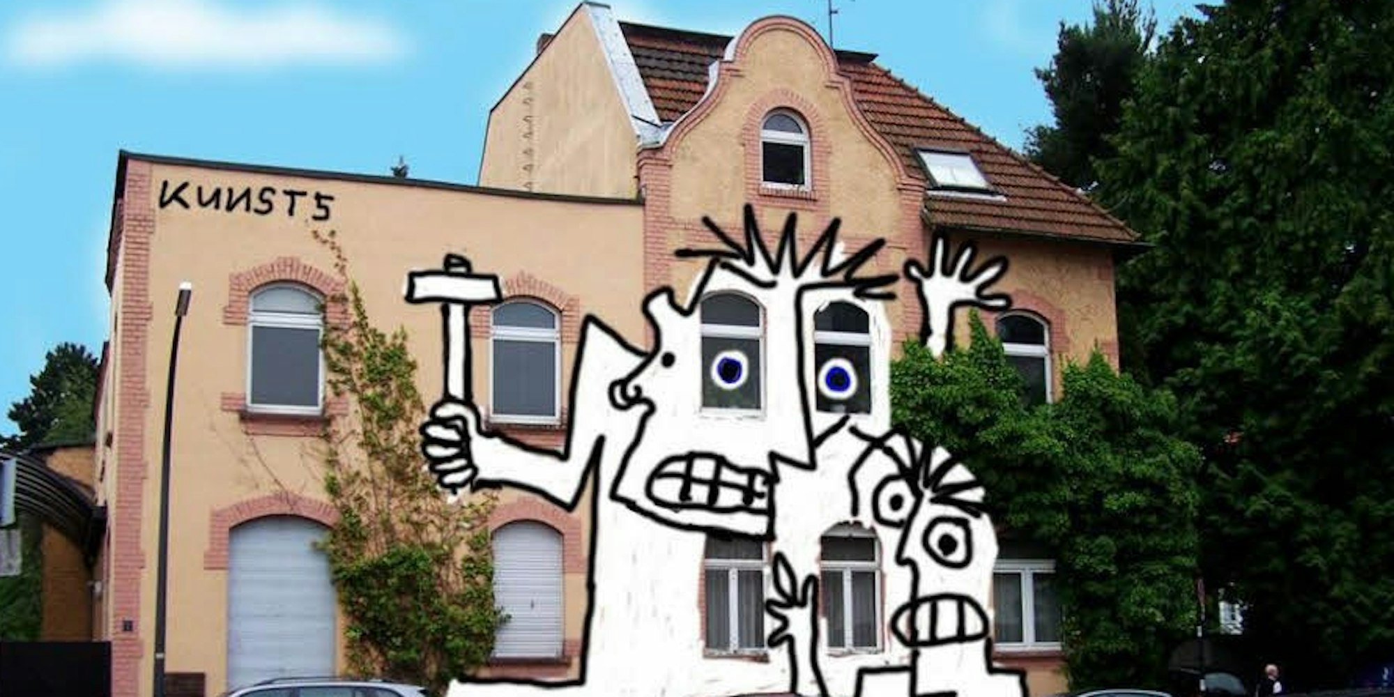 Marcus Krips, der von der Streetart kommt, hat schon seine Spuren hinterlassen im Treppenhaus, im Badezimmer, im Flur. Mit der Dose hat er die für ihn typischen, lustigen bis provokanten Strichfiguren aufgesprüht. Und so scheint es, als ob die guten Geister im alten Gemäuer lebendig sind. Zumindest bis Ende Mai.