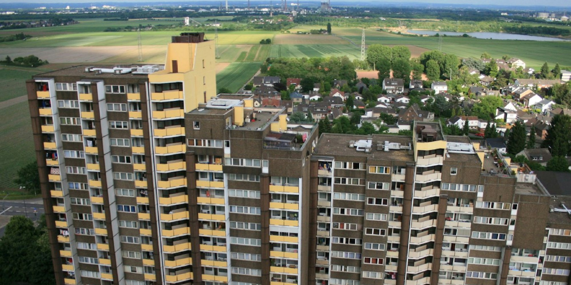 Hinter den Kölnberg-Blöcken An der Fuhr 2 und 3 sind die Meschenicher Einfamilienhäuser, Felder und das Naturschutzgebiet Kiesgruben zu sehen.