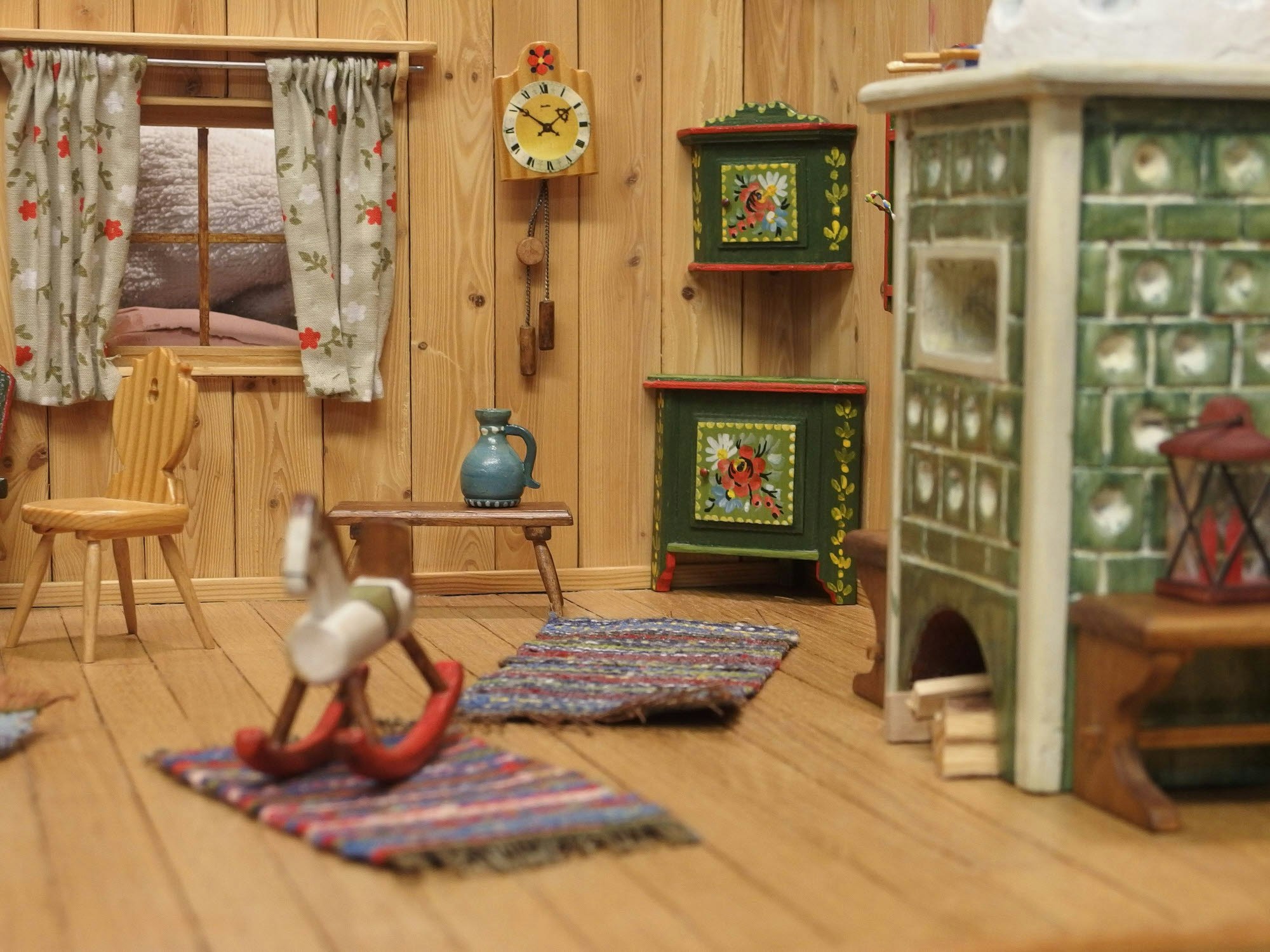 Und Hermann Nick machte alles selber. Vom Gebäude bis hin zu den Möbeln und den Äpfeln in der Obstschale fertigte er alles eigenhändig an. Unterstützung kam von seinem Schwager, der die Möbel bemalte.