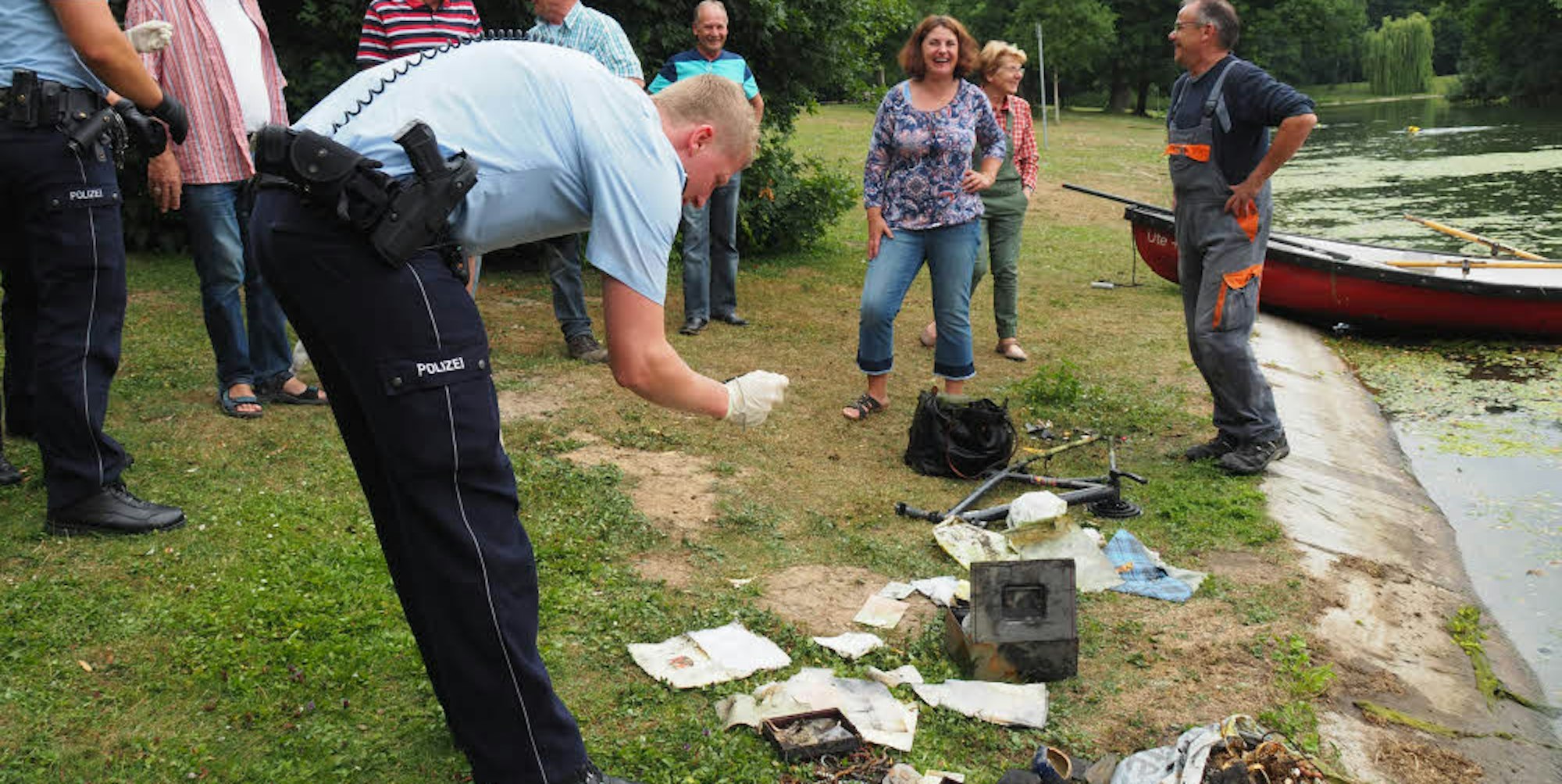 Die Polizei dokumentiert die Fundstücke, die Taucher im Weiher gefunden haben.