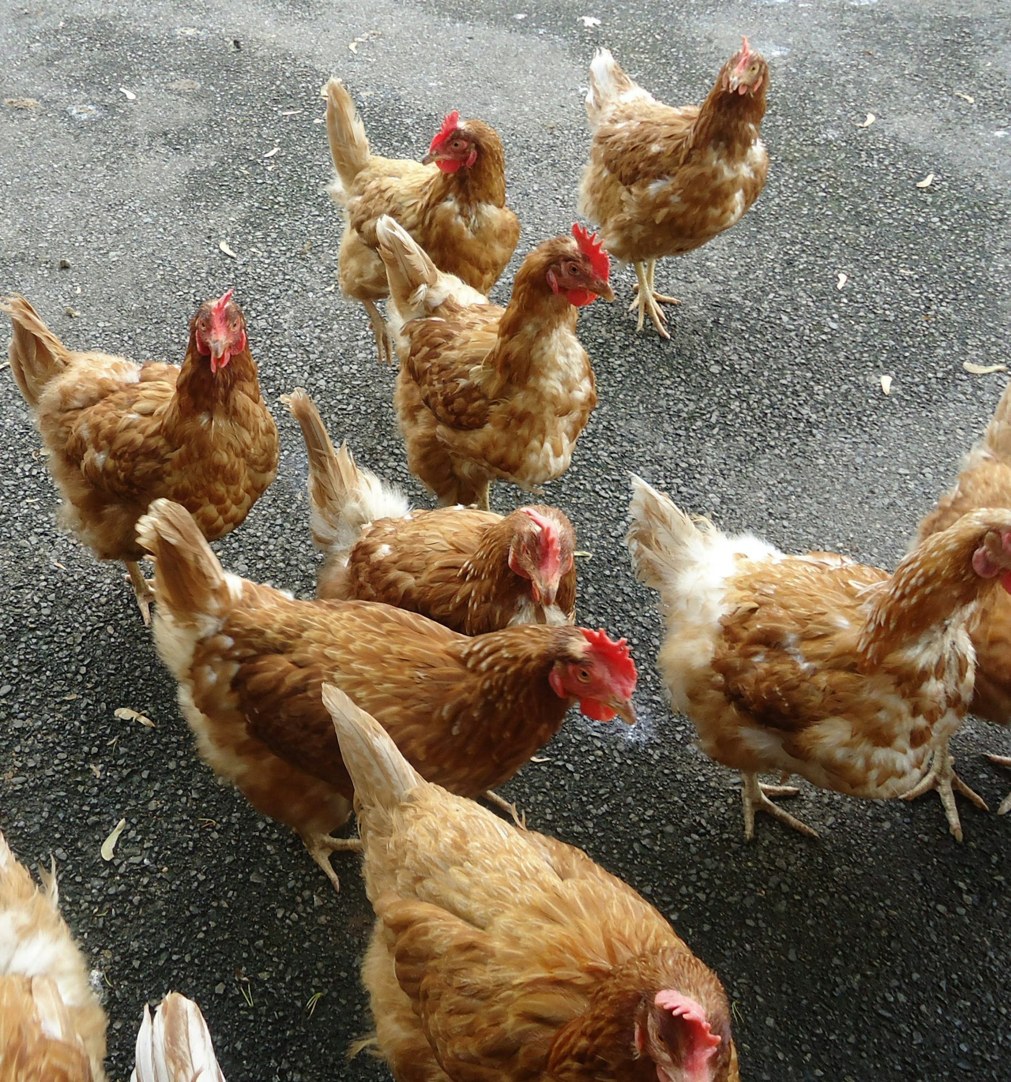 Auch Hühner leben im Heim; mit den Schweinen verstehen sie sich gut.l.).