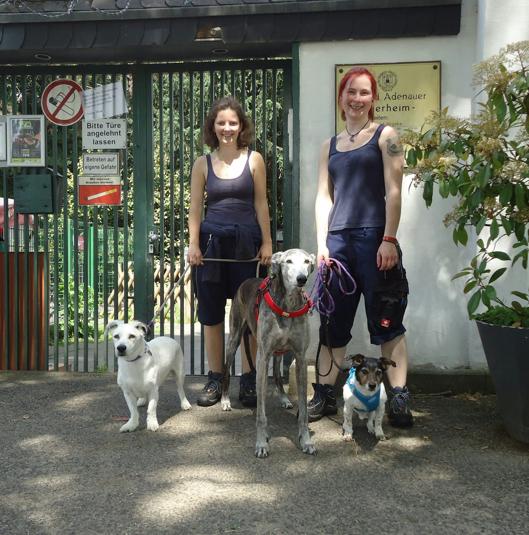 Zwei ehrenamtliche Helferinnen kehren vom Gassigehen zurück; zusammen posieren sie vorm Eingangstor fürs Foto.