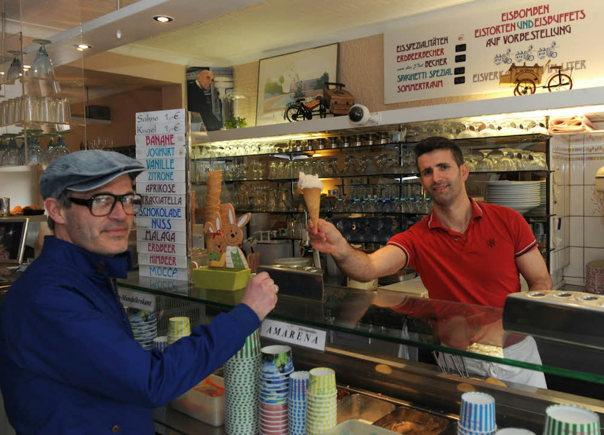 Am Höninger Platz steuern wir auf das Eiscafé Van der Put zu. „Der einzige Laden in Köln, in dem es die Sorte Pinien-Mandelkrokant gibt“, sagt er und lädt zum Probieren ein. „Schmeckt gut, oder?“