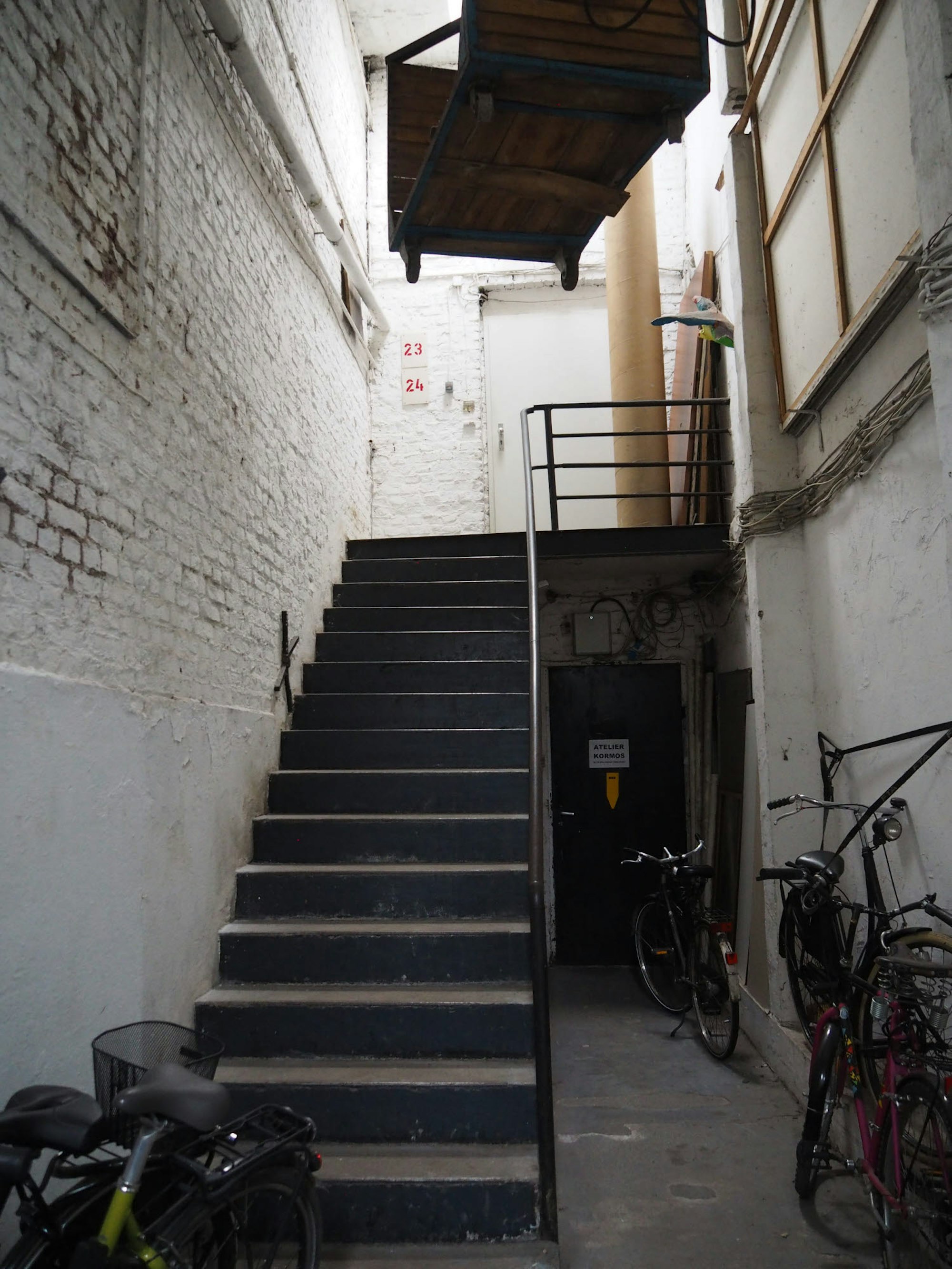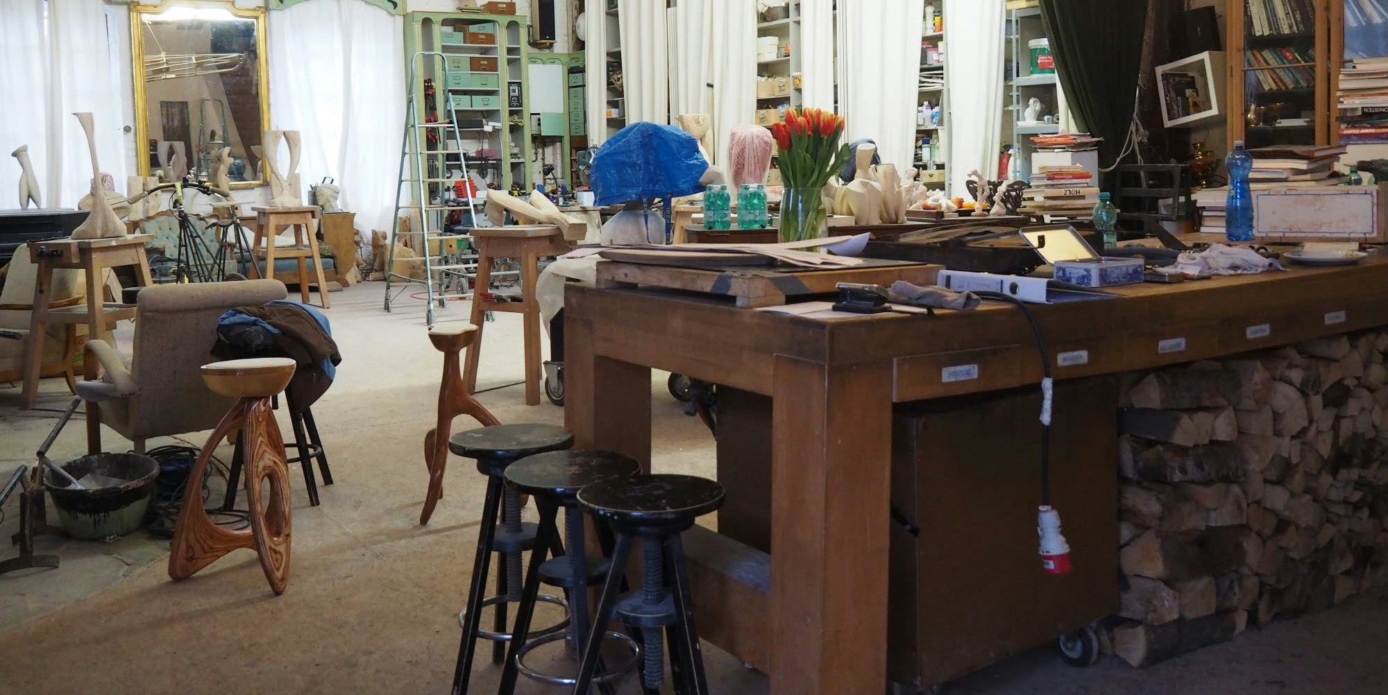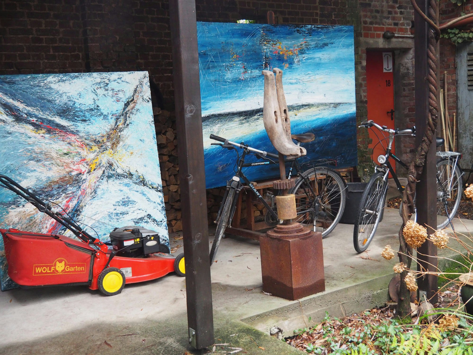 Kunstwerke im Garten, ein sanierungsbedürftiger Treppenaufgang und ein Blick ins Atelier von Sebastian Probst