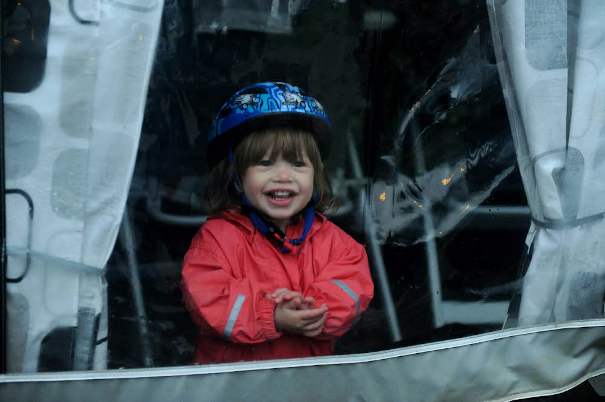 Die kleine Mae ist kaum im Vorzelt zu halten. Seit sechs Monaten kann sie laufen und springt mit ihren halbhohen Gummistiefeln voller Vergnügen in die Pfützen. Hier gilt die Devise: Nur ein dreckiges Kind ist ein glückliches Kind.
