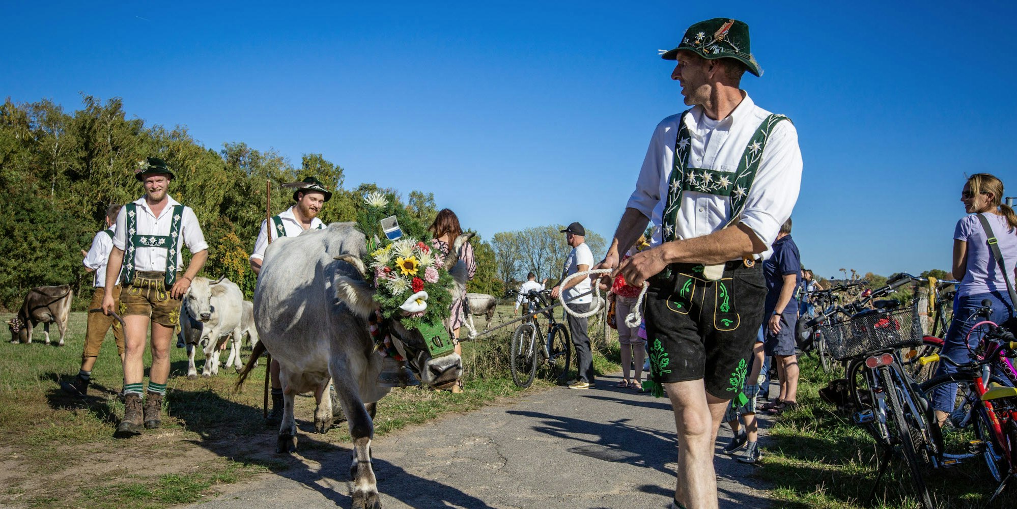 Seit 40 Jahren besucht Landwirt Bernd Lorbach (45) Freunde im Allgäu. „Der Almabtrieb dort hat mich schon immer fasziniert“, sagt er. Die Idee hat er mit an den Rhein nach Weiß gebracht, auch wenn es dort außer ein paar Maulwurfshügeln keine nennenswerten Erderhebungen wie im Allgäu gibt.