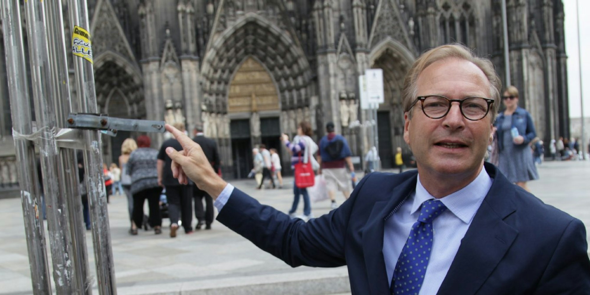 Blick auf die großen und kleinen Sünden: Paul Bauwens-Adenauer und eine vergessene Halterung an einem Lampenmast – direkt vor dem Weltkulturerbe Kölner Dom.