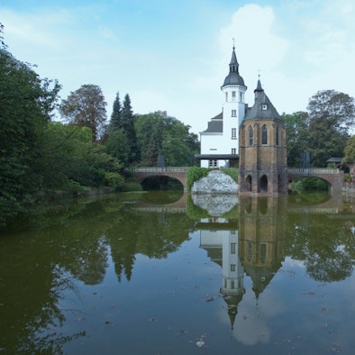 Das Weißhaus mit dazugehörigem Park und Wassergraben.