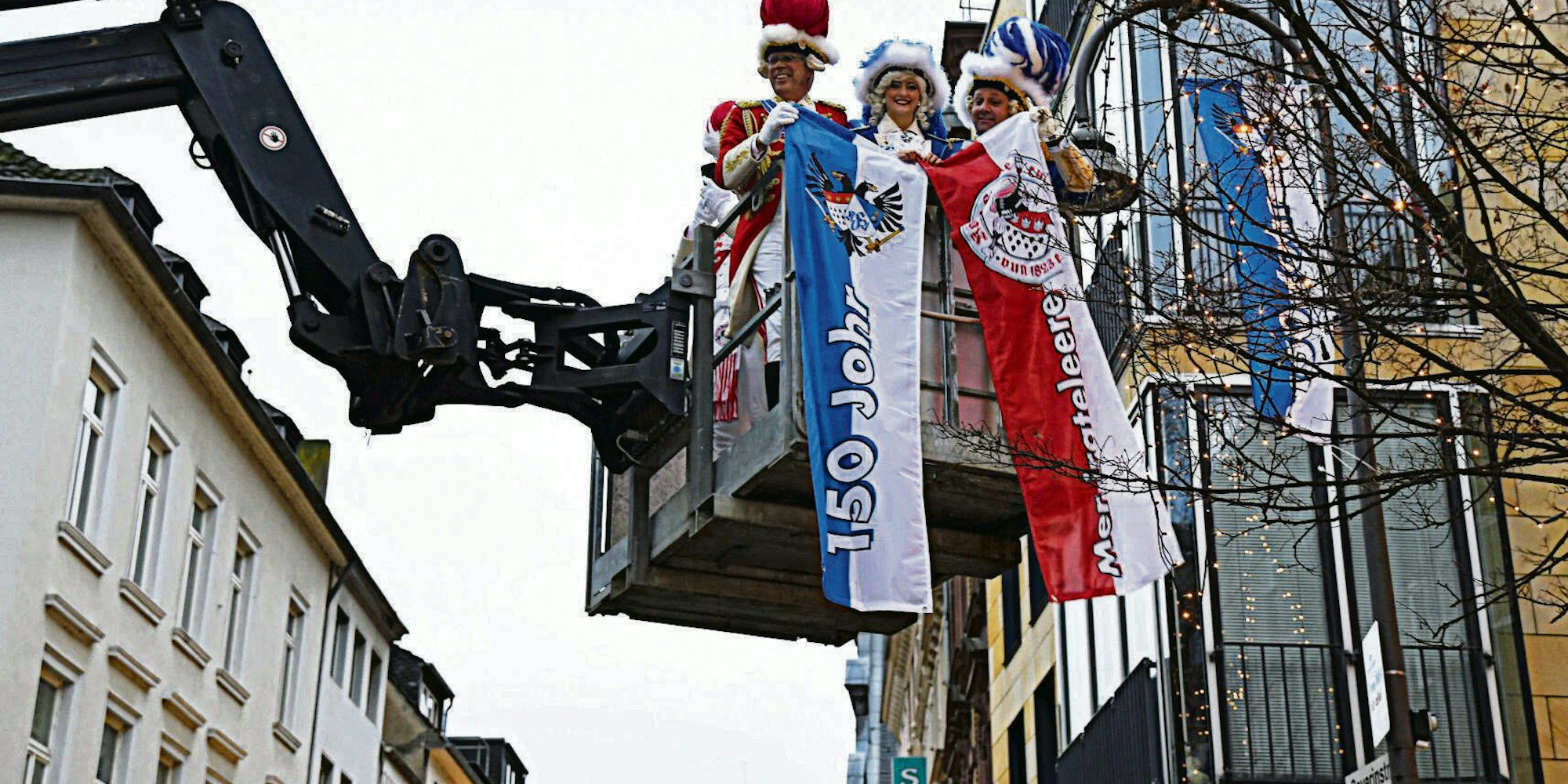 Die Funken beflaggen die Severinstraße: Björn Griesemann von den Blauen, Heinz-Günther Hunold von den Roten und Funkemariechen Marie Steffens packen’s gemeinsam an.