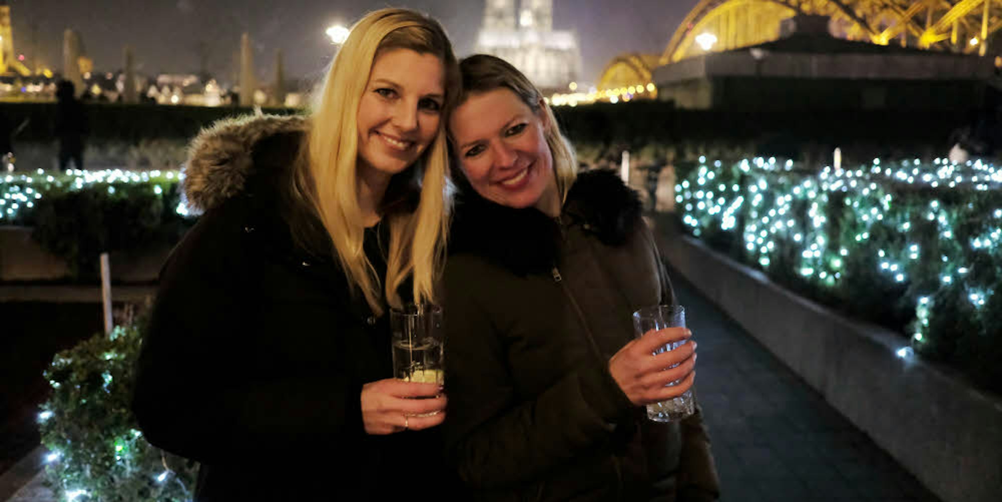 Besonders ist die Atmosphäre auch auf der Hohenzollernbrücke, auf der nicht ein einziges verliebtes Paar wandelt, dafür aber Tausende von Liebesschlössern im Scheinwerferlicht glänzen. Am Fuße der abgesperrten Brücke füllen sich in der letzten Stunde vor Mitternacht allmählich die Panorama-Plätze mit Blick auf Altstadt und Dom. Vor dem „Hyatt“ stehen zwei Frauen und prosten sich zu: „Ich bin komplett ohne Erwartungen hierhergekommen und war auf einen Abend zu zweit eingestellt, erklärt Andrea, die am Barbarossaplatz wohnt und von ihrem Mann die Nacht im Hotel geschenkt bekommen hatte. „Und nun habe ich hier supernette Menschen kennengelernt.“ Claudia aus Castrop-Rauxel, ebenfalls mit Mann und noch zwei Kleinkindern für eine Nacht in Köln, bestätigt, „dass dies der Beginn einer wunderbaren Freundschaft werden kann“.
