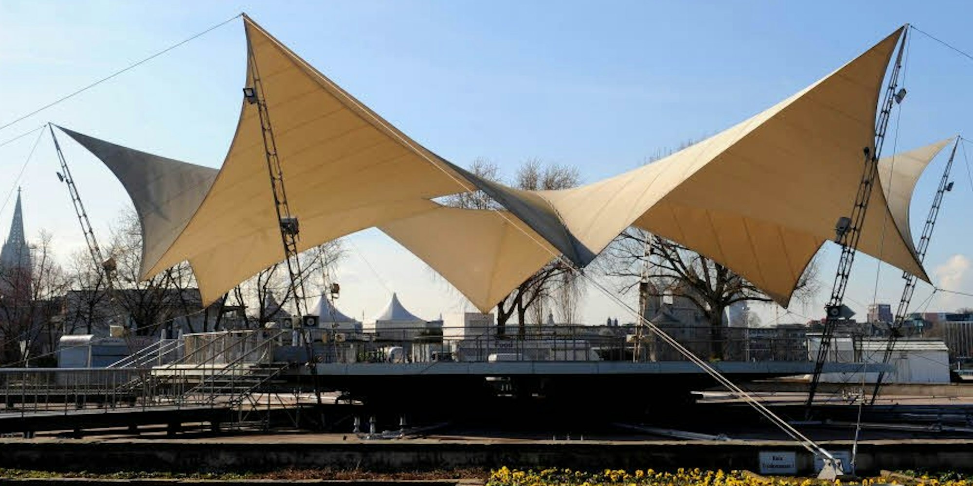 Die großen Segel des markanten Sternwellenzelts über dem Tanzbrunnen wirken leicht, luftig und elegant. Architekt Frei Otto entwarf die damals neuartige Konstruktion – die ihm später als Vorbild für das Olympiastadion in München dienen sollte – für die Bundesgartenschau 1957. Danach sollte der Überbau aus einem 1000 Quadratmeter großen und 2,5 Tonnen schweren Baumwollsegeltuch wieder verschwinden. Da das Sternwellenzelt sehr beliebt war, blieb es aber bestehen und wurde stets im Winter ab- und im Sommer aufgebaut.