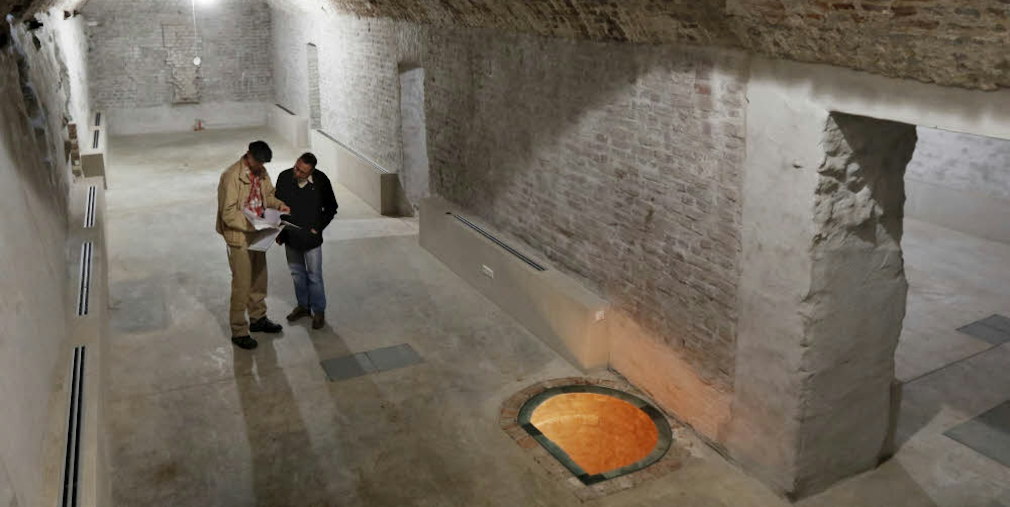 Einer der sechseinhalb Meter hohen Gewölbekeller mit beleuchtetem Brunnen