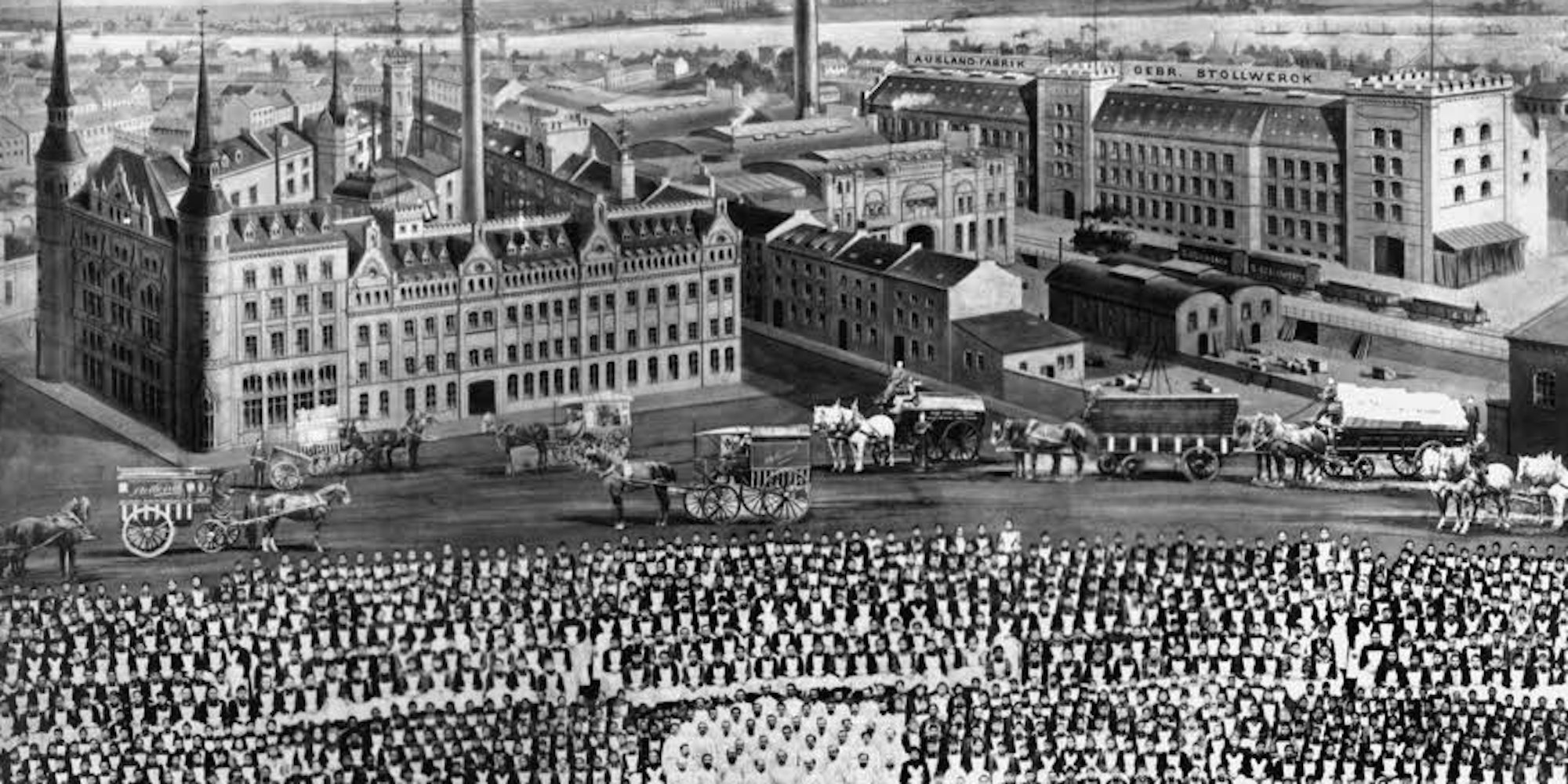 Die Stollwerck-Belegschaft 1894 im Severinsviertel. Die Montage stammt aus dem Buch „Stollwerck. Schokolade aus Köln“ von Sascha Widdig, Sutton-Verlag. Mitte der 70er zog Stollwerck nach Porz, die meisten Gebäude in der Südstadt wurden später abgerissen.