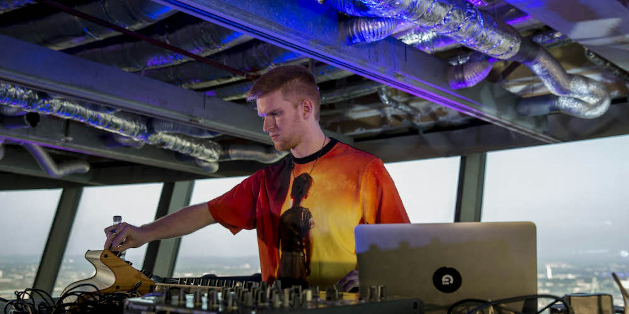 Bei einem beeindruckenden Ausblick über die Dächer Kölns stand der weltweit agierende Performer und Produzent Tim Engelhardt an dem für ihn eigens aufgebauten DJ-Pult. Dort beschallte er rund 90 Minuten lang die Plattform des Funkturms mit elektronischen Beats. Unter dem wachen Auge seines Vaters – den hatte der Wahlkölner zu seinem außergewöhnlichen Auftritt mitgebracht. Und der freute sich: „Ich war noch nie hier oben, das ist natürlich toll, das mit meinem Sohn zu erleben.“
