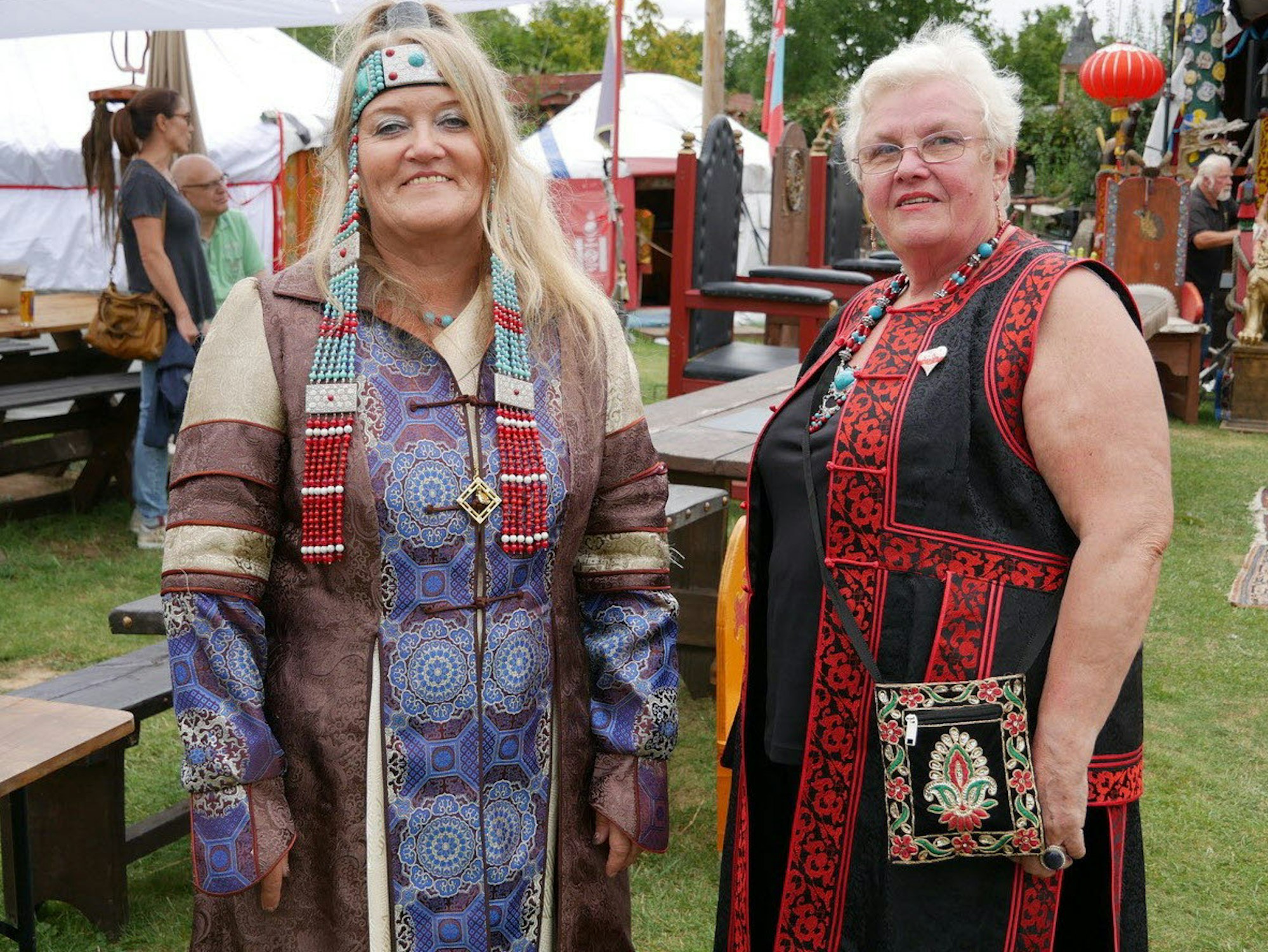Ursula Pfeifer hat es bei der Namensvergabe bis zur Schwester des legendären Dschingis Khan gebracht, seit 23 Jahren ist „Temulun“ aktives Mitglied. „Außerhalb der Mongolei sind wir das größte Mongolenlager“, erklärt sie begeistert, „in diesem Jahr haben wir unser 35-jähriges“. Michael Donovan, genannt „Noyon Dai Sechen“, erzählt amüsiert von den Anfängen der Mongolenhorde und ihrem damals noch eher hunnenartigen Outfit. Mit einer waschechten Mongolin in ihren Reihen kommen Fauxpas stilistischer Art natürlich nicht mehr vor.