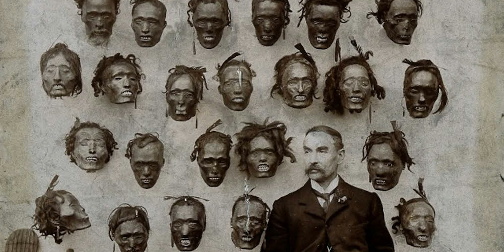Das Foto, aufgenommen um 1900, zeigt den umstrittenen Sammler Horatio Robley vor seiner Sammlung von Maori-Schädeln. Der Kölner Maori-Schädel durfte nicht fotografiert werden.