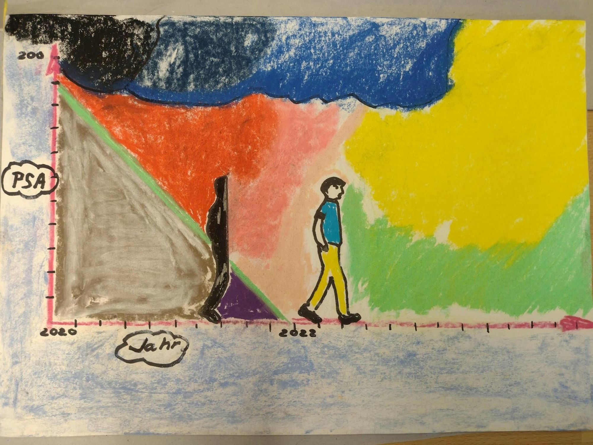 Bernd Evers, 72 Jahre alt, hat das Bild im Rahmen einer Kunst- und Gestaltungstherapie im Haus Lebenswert gemalt. Es zeigt mehr als bloß Achsen und Zahlen: Da wäre noch die schattenhafte, dunkle Figur, die über die Zeitachse läuft – und der in bunte Farben gekleidete Mann, der aus dem Schatten heraus ins Helle tritt, als die PSA-Skala im Jahr 2022 in den Normalbereich fällt. „Der dunkle Schatten ist der Schrecken des Krebs“, beschreibt Evers. „Und die Figur zeigt, wie ich aus dem Schatten heraustrete, beweglicher als vorher, ohne Schmerzen und ohne Angst.“