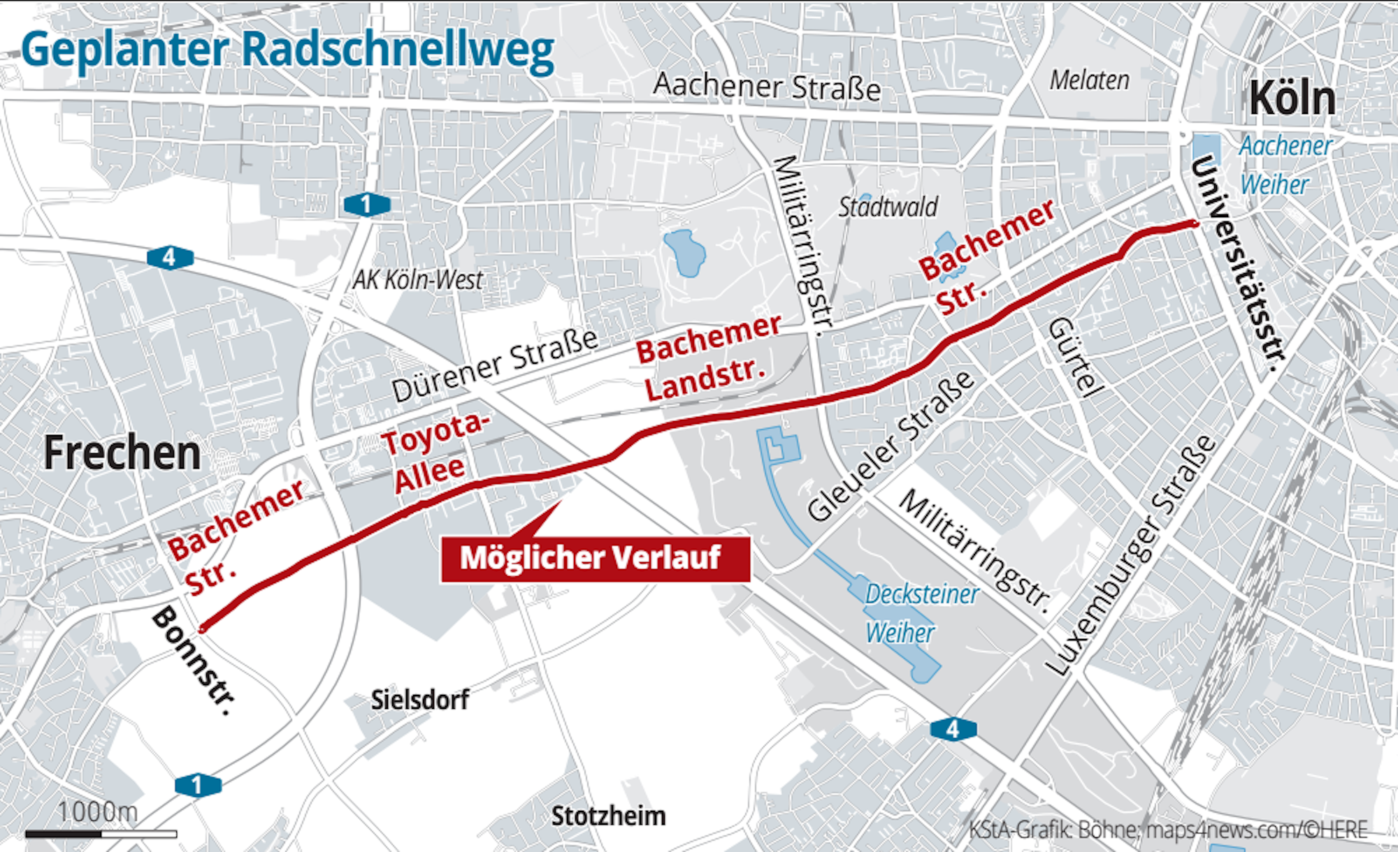 Während die Stadt für die Bachemer Straße und die Toyota-Allee verantwortlich ist, fallen die Bachemer Landstraße und das Frechener Stadtgebiet in die Zuständigkeit des Landesbetriebs Straßen NRW. „Für den Fall, dass die Abschnitte des Landesbetriebes Straßenbau NRW in die Vergabe integriert werden können, ist mit geringeren Gesamtkosten für das Baugrundgutachten zu rechnen, da zum Beispiel die Baustelleneinrichtungen und Gerätevorhaltungen gegebenenfalls zusammengefasst und reduziert werden können“, heißt es in der Beschlussvorlage der Stadt Köln.