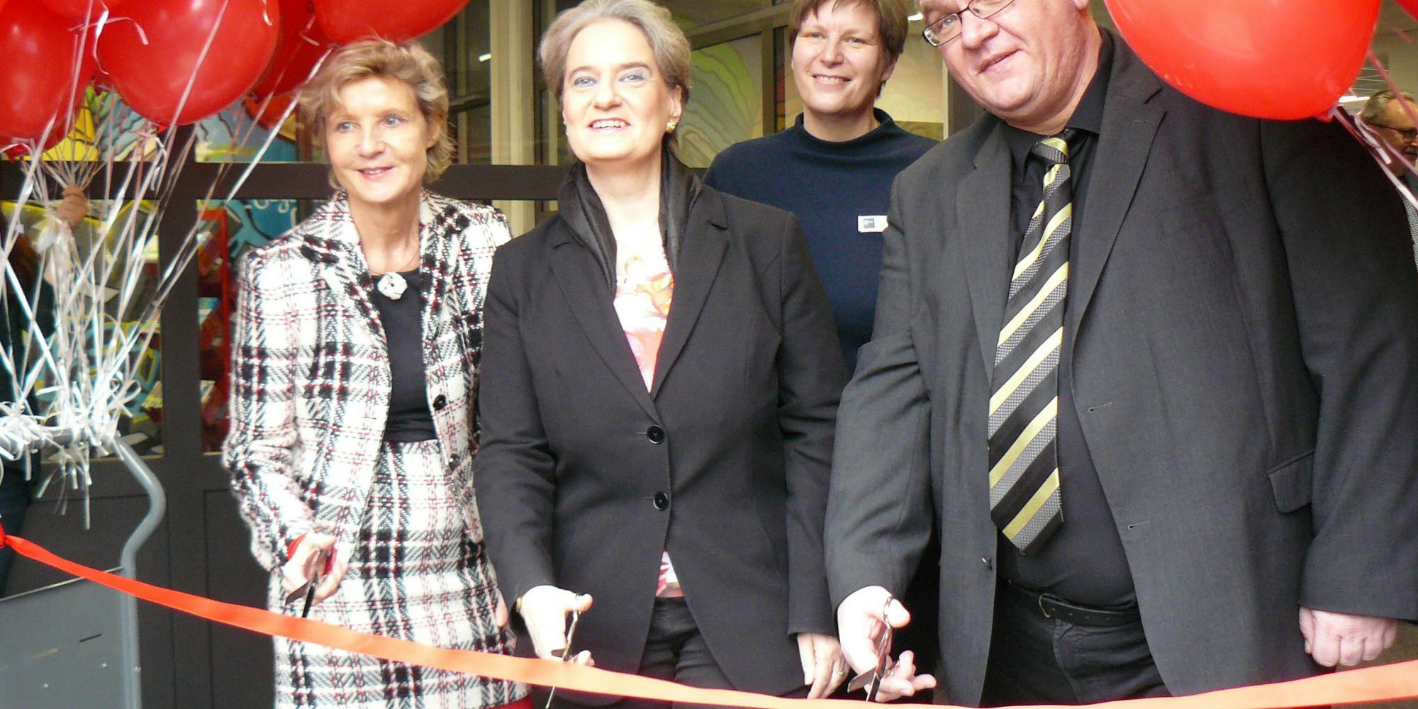 Chorweiler – Einige zersprangen mit einem lauten Knall, andere klebten an der Decke: Rote Luftballons, die am frühen Morgen noch, zu zwei Sträußen zusammengebunden, den Eingang der Stadtteilbibliothek in Chorweiler-Mitte geschmückt hatten. Anlass war die feierliche Wiedereröffnung der frisch sanierten Bücherei. Nachdem das rote Band zerschnitten war, liefen die Kinder mit den Ballons durch die Räume, ließen sie zerplatzen oder eben aufsteigen. "Heute Abend holen wir sie alle von der Decke wieder runter", sagte eine Bibliotheksmitarbeiterin lachend. Es war ein Tag, um zu feiern, und viele feierten mit. Die Tür war noch geschlossen am Morgen, da begehrten schon die ersten Besucher ungeduldig Einlass. Gleich drei Scheren waren nötig: Am roten Band betätigten sich Hannelore Vogt, Direktorin der Kölner Stadtbibliothek, Kulturdezernentin Susanne Laugwitz-Aulbach und Bezirksbürgermeister Reinhard Zöllner.