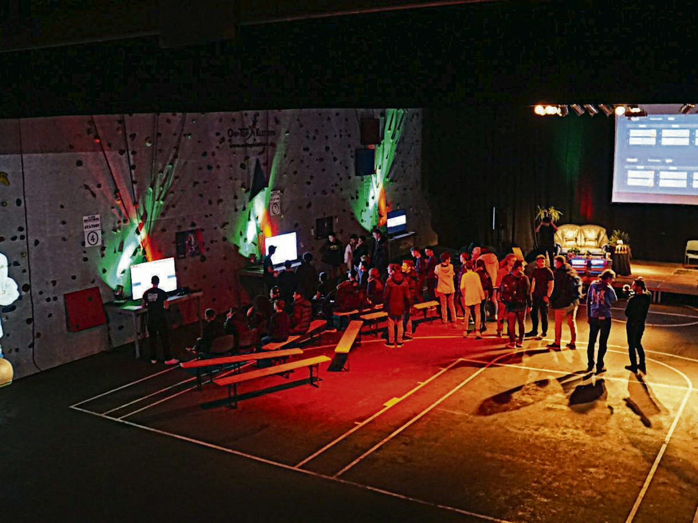 Nachdem die Gruppen eingeteilt waren, ging es schließlich an die Controller. An acht Stationen spielten jeweils vier E-Sportler in Zweier-Teams gegeneinander. Die Ergebnisse wurden auf eine Leinwand über der Bühne projiziert. Damit alles fair blieb, überwachten Schiedsrichter an jeder Station die Situation. „Schimpfwörter und Beleidigungen sind strengstens verboten“, hatte Yagiz von der Bühne aus klar gemacht. Aus den Boxen schallte die typische Konsolen-Spielmusik und auf der Kletterwand der Halle erschienen abwechselnd die verschiedenen Spielcharaktere. Wo sonst geturnt, geklettert und getobt wird, starrte nun alles konzentriert auf die Bildschirme. Jubel verkündete das Ende einer Partie.
