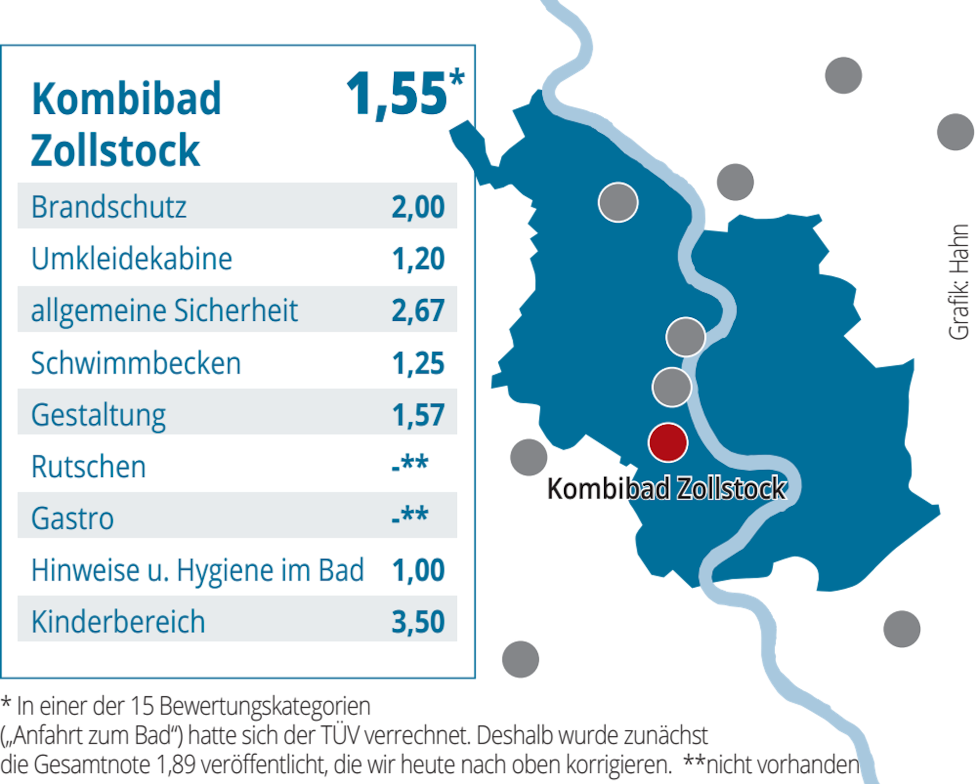 Beim Angebot für Kinder fiel das Tüv-Ergebnis enttäuschend aus: Die Testerin beschreibt das Kinderbecken als relativ unkreativ und neutral. Außerdem gebe es kein Wasserspielzeug. Und so gab es die im Test am schlechtesten vergebene Note 3,5 für das Kinderangebot im Zollstockbad. Die Köln-Bäder teilen dazu auf Nachfrage mit: „Wasserspielzeug ist aus hygienischen Gründen generell in den Köln-Bädern nicht vorhanden, hier bringen sich Eltern für die Dauer ihres Aufenthalts auf Wunsch gerne eigene Spielmaterialien mit.“ Die Betreiber weisen außerdem auf das Angebot für Kinder im Außenbereich hin, der jüngst „umfänglich attraktiviert“ worden ist. Es seien neue Umkleide- und Sanitärbereiche sowie ein neues Klettergerüst entstanden.