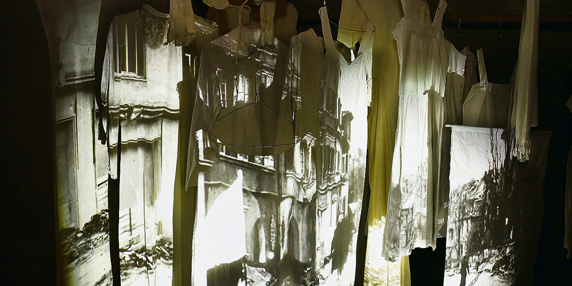 Gewänder, auf die Bilder zerbombter Häuser projiziert werden