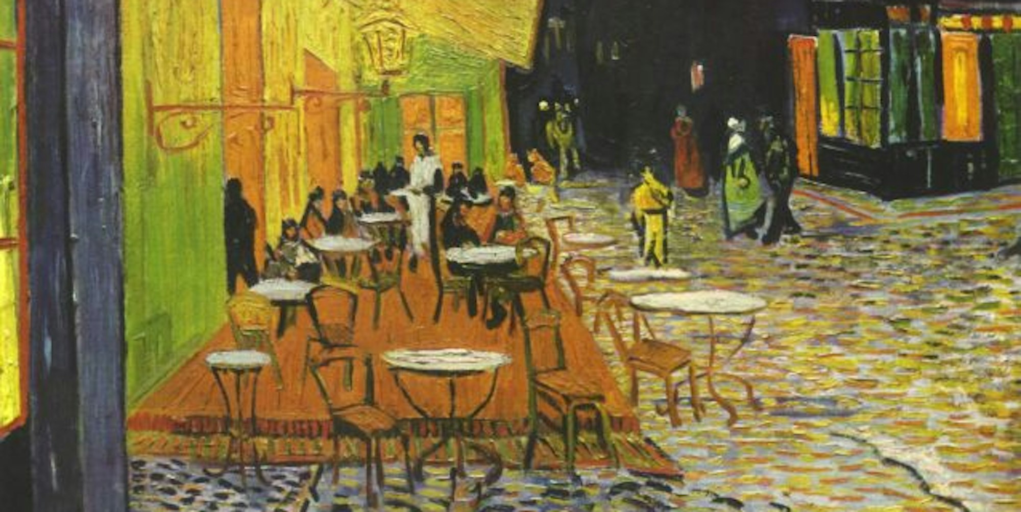 Die „Caféterrasse am Abend“ ist ein schönes Beispiel dafür, wie van Gogh die Wirklichkeit durch die Gefühlswelt der Farben verwandelte – eine Welt, die für ihn auf der Leinwand nicht weniger wirklich war als diejenige, die er vor sich sah. Das Gemälde gehört zu jenen van Goghs, die besonders gerne auf Postkarten gedruckt werden – weshalb die Fachwelt erstaunt aufhorchte, als der Kunsthistoriker Jared Baxter vor einigen Jahren eine gänzlich neue und überraschende Deutung des Motivs anbot. Das Straßencafé, so Baxter, sei van Goghs Version des letzten Abendmahls, mit dem Kellner als Jesus und den zwölf Gästen als dessen Jüngern.