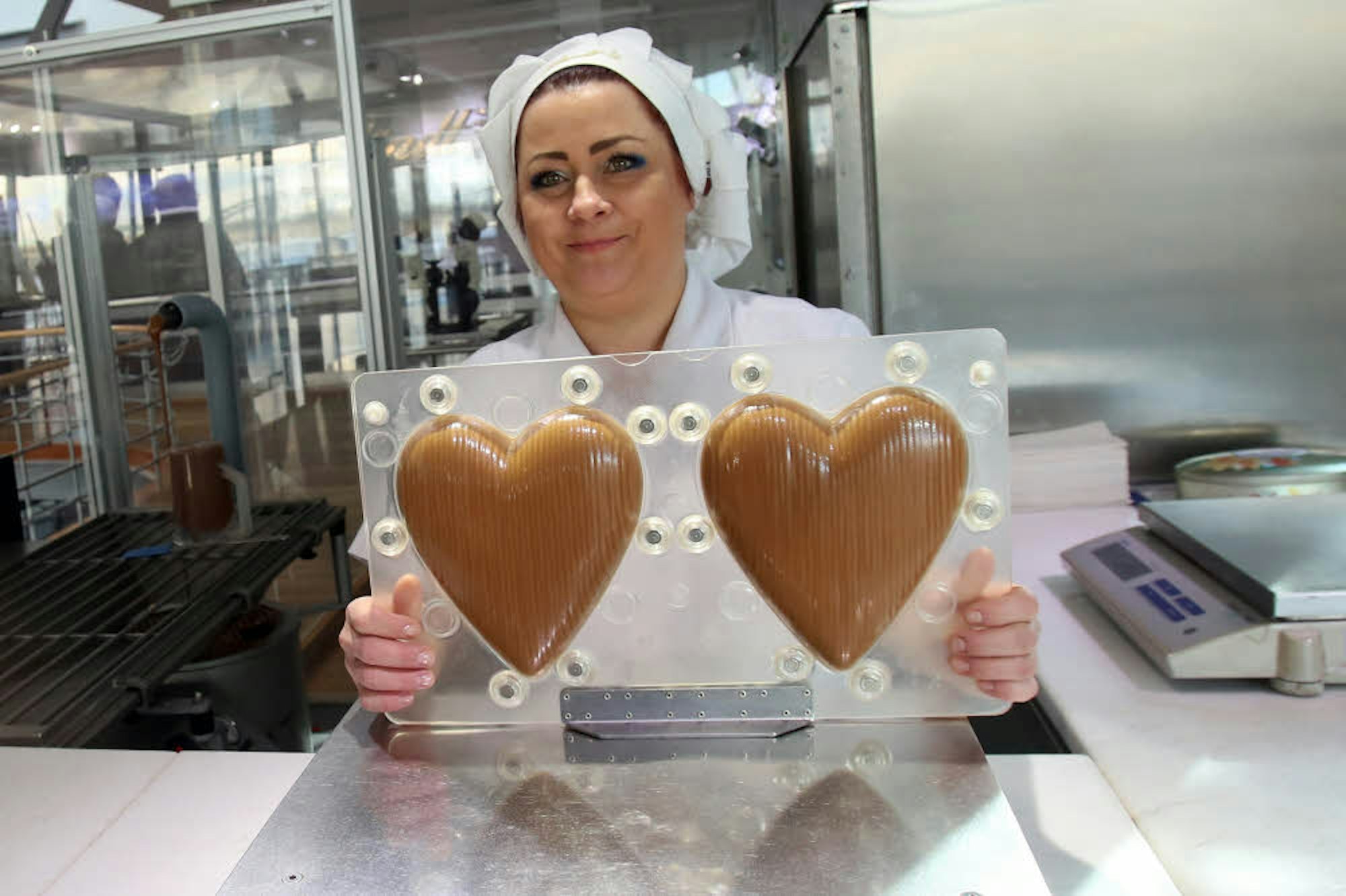 Diese Herzen werden erst befüllt und dann stundenlang in einer Maschine gewendet, damit sich die Schokolade am Rand gleichmäßig absetzt.