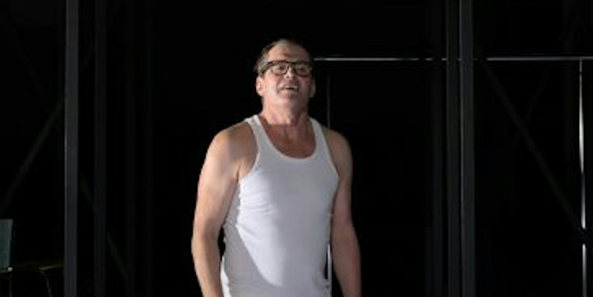 Doch dann, während seine Stimme noch über die Lautsprecher ertönt und man noch nicht ganz begriffen hat, dass es sich um eine Aufzeichnung handelt, steht er vor uns, legt die Spießerverkleidung ab, reißt die schweren Vorhänge, die den Glaskasten einrahmten, herunter, und redet einfach weiter. Wie irgendeine Kneipenbekanntschaft.