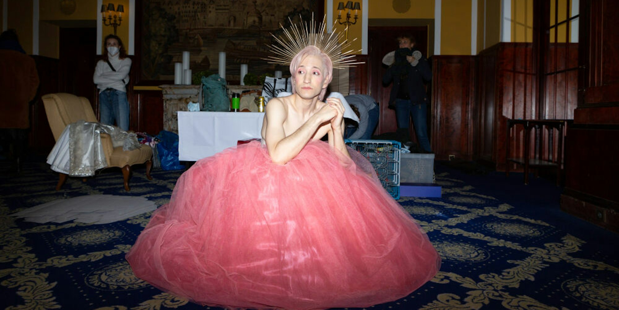 Teresa Verghos Kostüme erinnern an Jeff Koons’ Rokoko-Porno-Kitsch, und Alexander Angelettas Edward II. erscheint mit seinem orangen Tüllrock, freien Oberkörper, pink gefärbten Haar und madonnenhaften Strahlenkranz eher als Dragqueen von heute, denn als Monarch des späten Mittelalters.