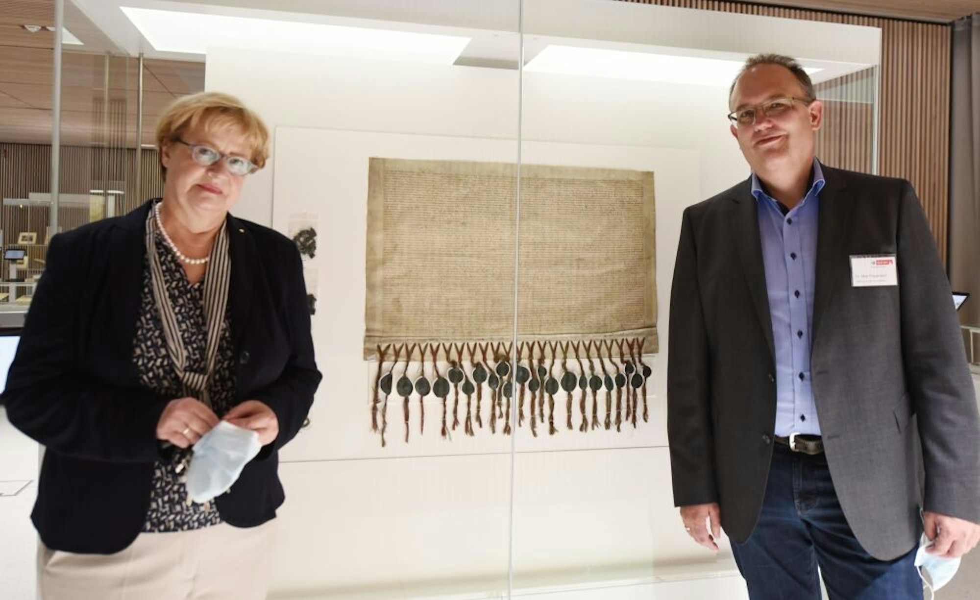 Bettina Schmidt-Czaia, leitende Archivdirektorin, und Kurator Max Plassmann vor dem Kölner Verbundbrief von 1396