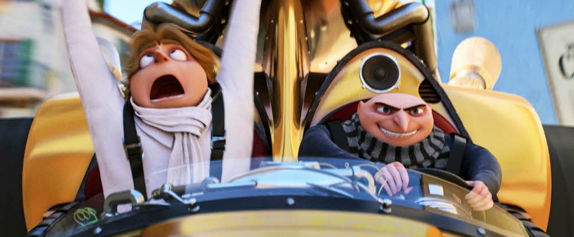 Gru (r.) zeigt seinem Halbbruder Dru, wie sich ein echtes Schurkenmobil fährt.