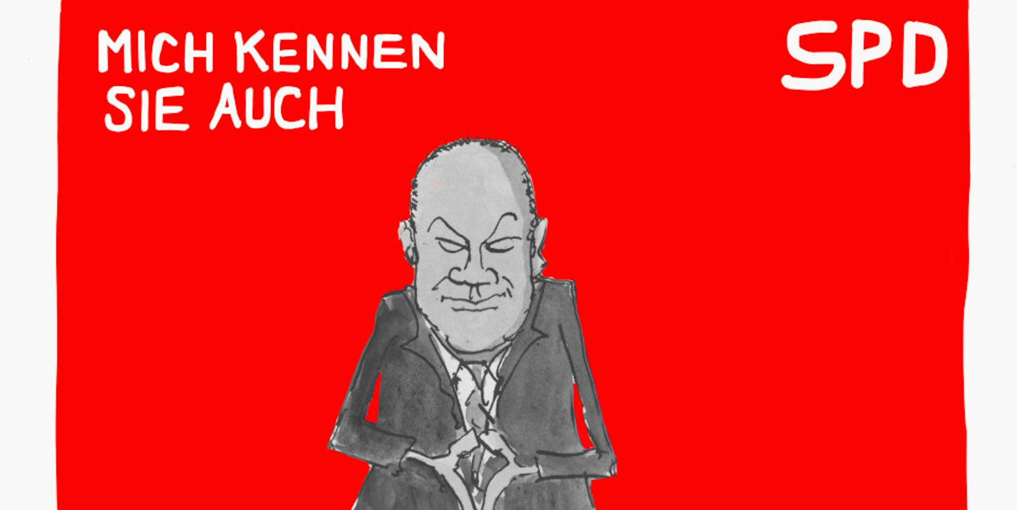 Die unwahrscheinliche Aufholjagd der alten Tante SPD sah im Wahlkampf vermutlich niemand kommen – auch unsere Karikaturisten rieben sich erstaunt die Augen. Das Erfolgsgeheimnis des neuen Kanzlers zeichnen beide ähnlich: Wenig sagen, auf die Fehler der Konkurrenz warten und als Merkel’sche Verlässlichkeit posieren. „Lächeln und Kichern sind eh nicht dein Ding“, gibt die SPD ihrem Kandidaten bei Sakurai mit auf den Weg. Bei Plaßmann ist Scholz ein Plagiat seiner Vorgängerin: „Sie kennen mich auch.“