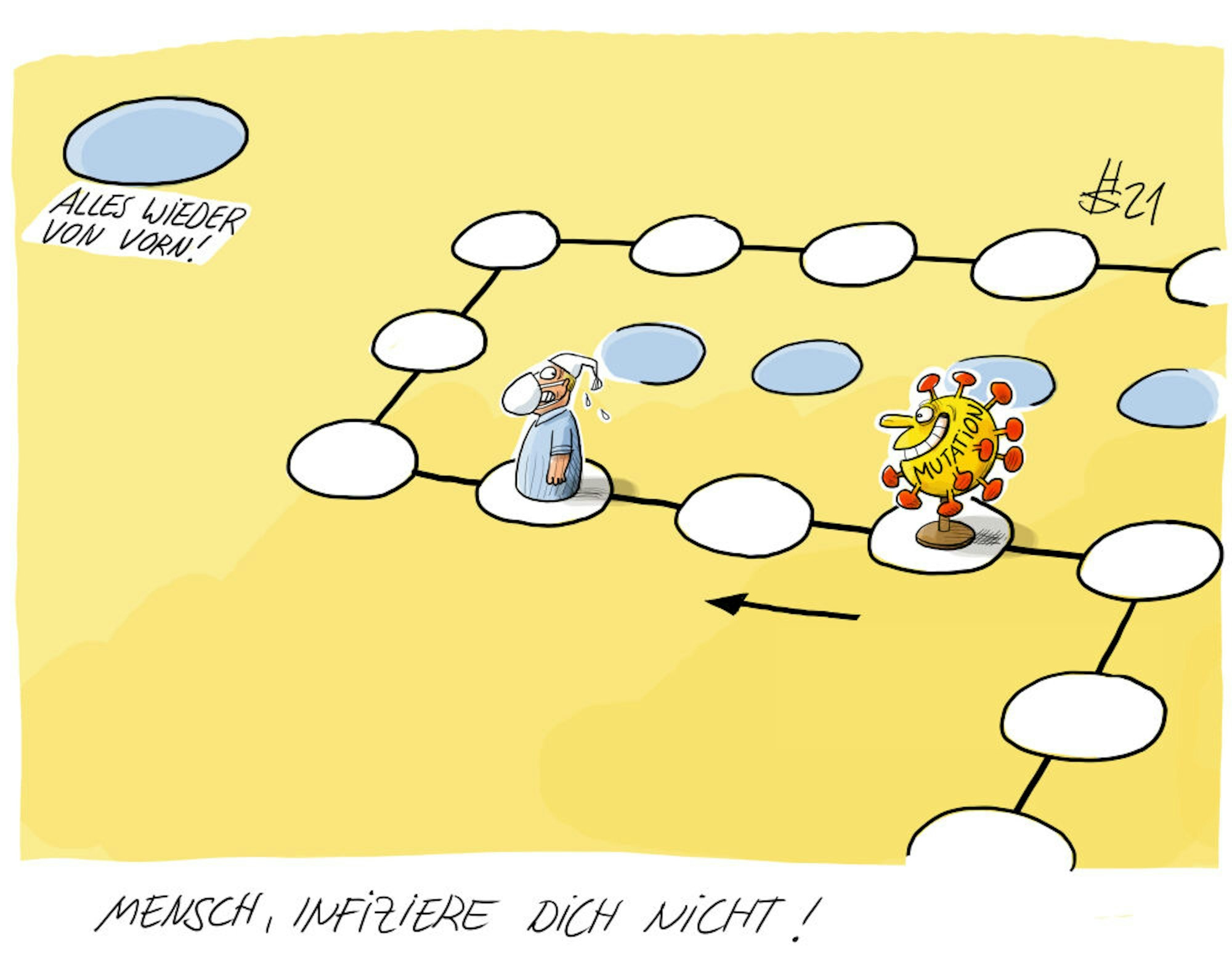 Am Ende dieses Jahres wurden dann auch die Karikaturisten des „Kölner Stadt-Anzeiger“ von Corona eingeholt. Dabei beginnt Plaßmanns Rückblick auf 2021 mit dem Kapitel „Endlich raus aus dem Lottdown“ und einem Kleinkind, dessen erste Worte „Torona“ und „Impftdesaster“ sind. Zurück auf Los heißt eben auch: Gefangen zwischen Hoffen und Bangen.